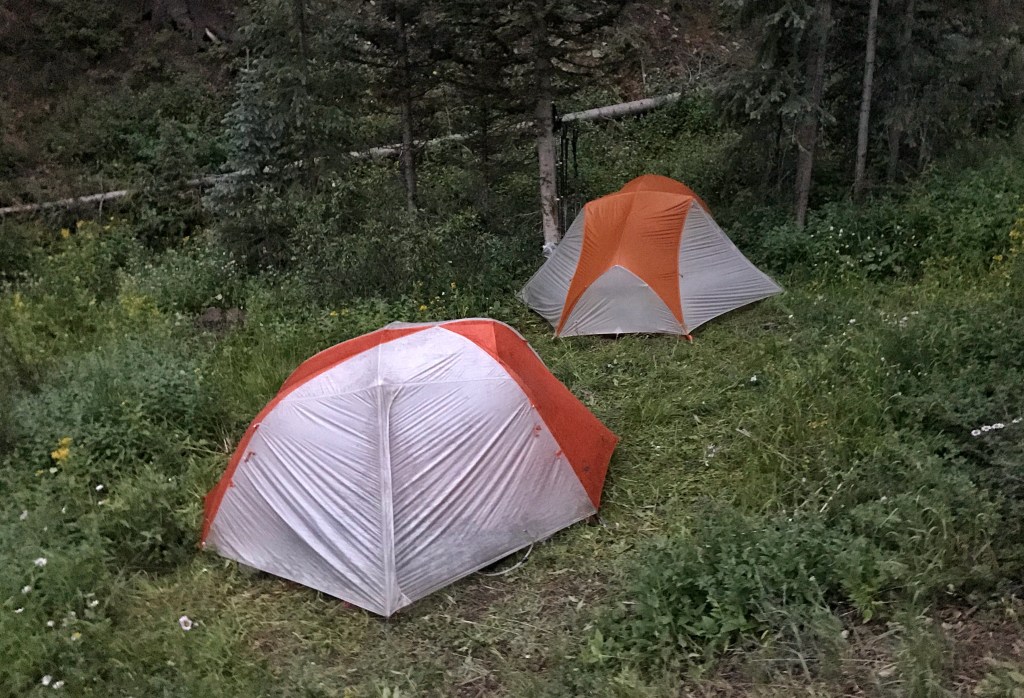 We reach the Silver Creek Trail junction eager to find a campsite and pitch the tent before it rains. We pass on a few sites near the top of the hill, thinking they may be too exposed. Instead, we descend 300 feet and a third of mile down trail. The good news: Silver Creek is flowing well! The bad news: there are no flat tent spaces.