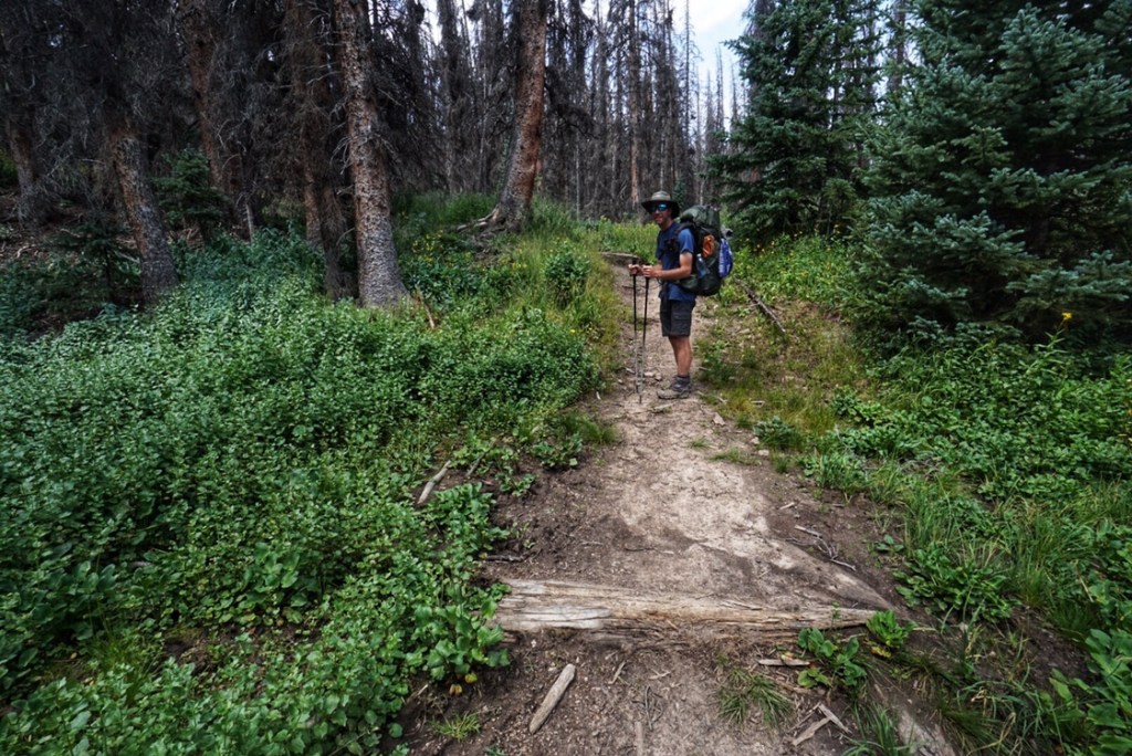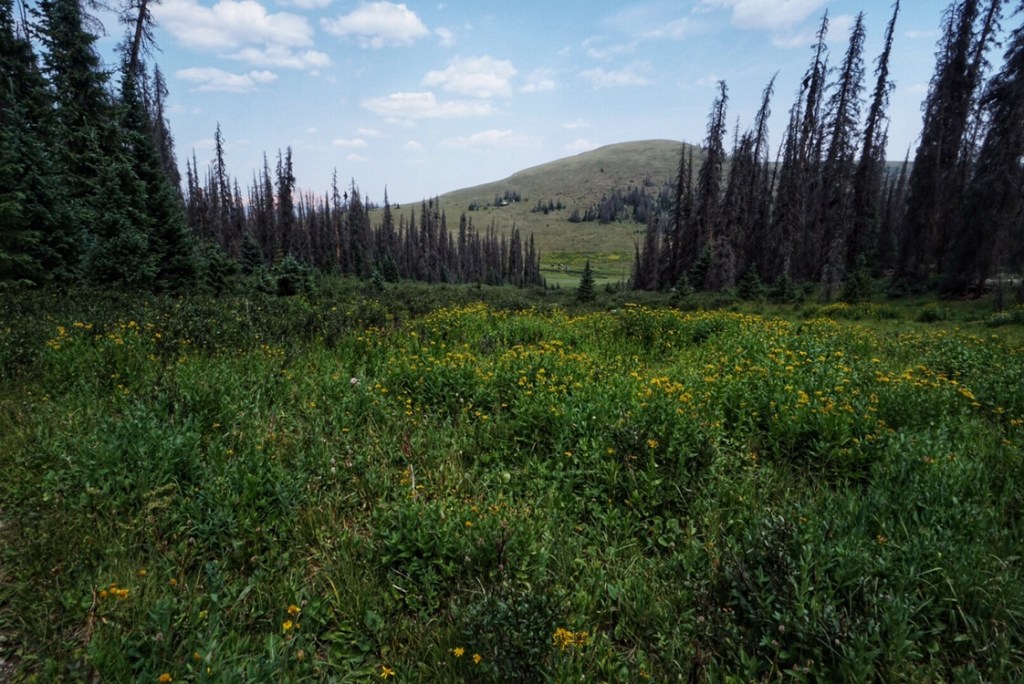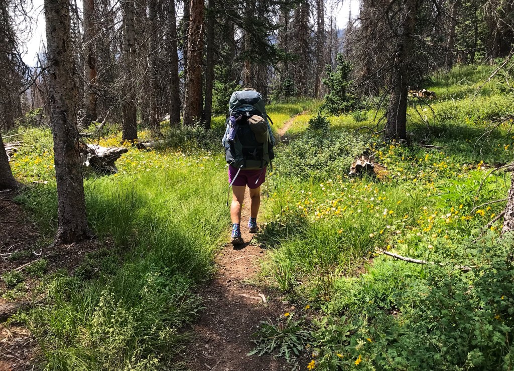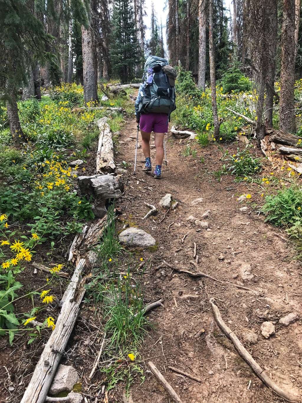 For a brief time we descend back below treeline and enjoy a little shade and the first real lush greenery and wildflowers we have seen in several days.