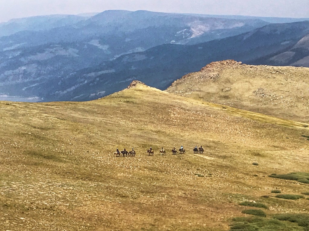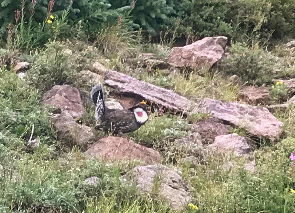 The sun warms us as we clean up. I enjoy a cup of coffee, and we notice a small herd of our elk grazing down below. We are even rewarded with a proud, male dusky grouse who struts through camp with his tail feathers up, displaying his red neck patches to attract any females who may be interested in his company.