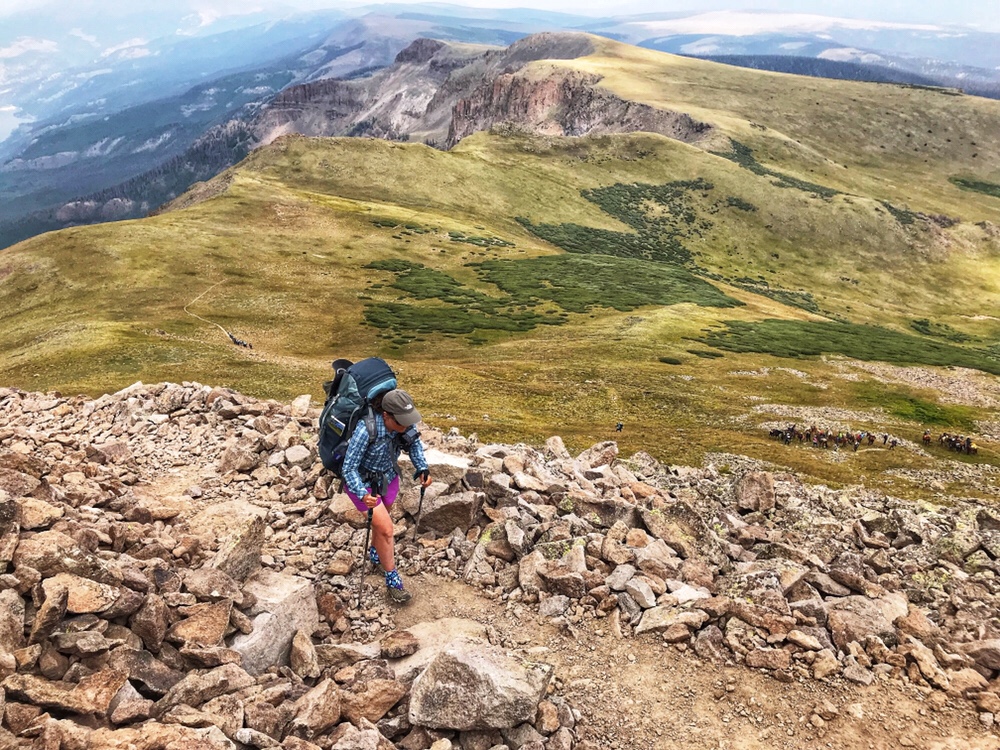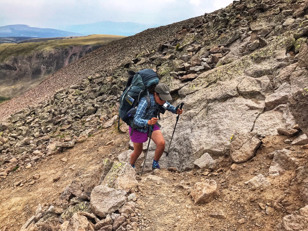 Of course, once we reach the top of this pass we realize it’s a false summit. We contour the mountain, dip down, cross a rocky scree section of trail and dip down again before making the final switchbacks to the highest point on the Colorado Trail at 13,271 feet. It’s extremely windy up here, so, with yet another milestone behind us, we plod on downhill.