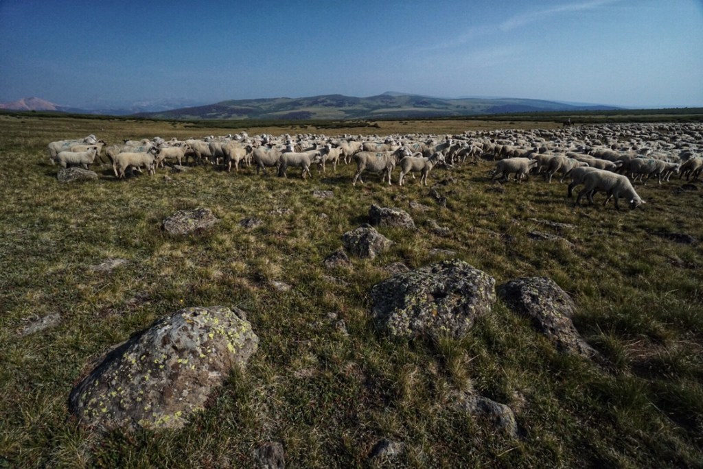 We are making good time when, off in the distance, we see a phalanx off fuzzy wool coming at us, mowing down the short grass as it moves. We’ve seen scenes like this before in Albania and Peru, but never here in the US, so it seems out of place. We watch as the sheep move together, guided by a shepherd on horseback and his trusty sheepdog. The sheep seem oblivious to me as I photograph them, until I make a sudden move, and they all scurry away from me.