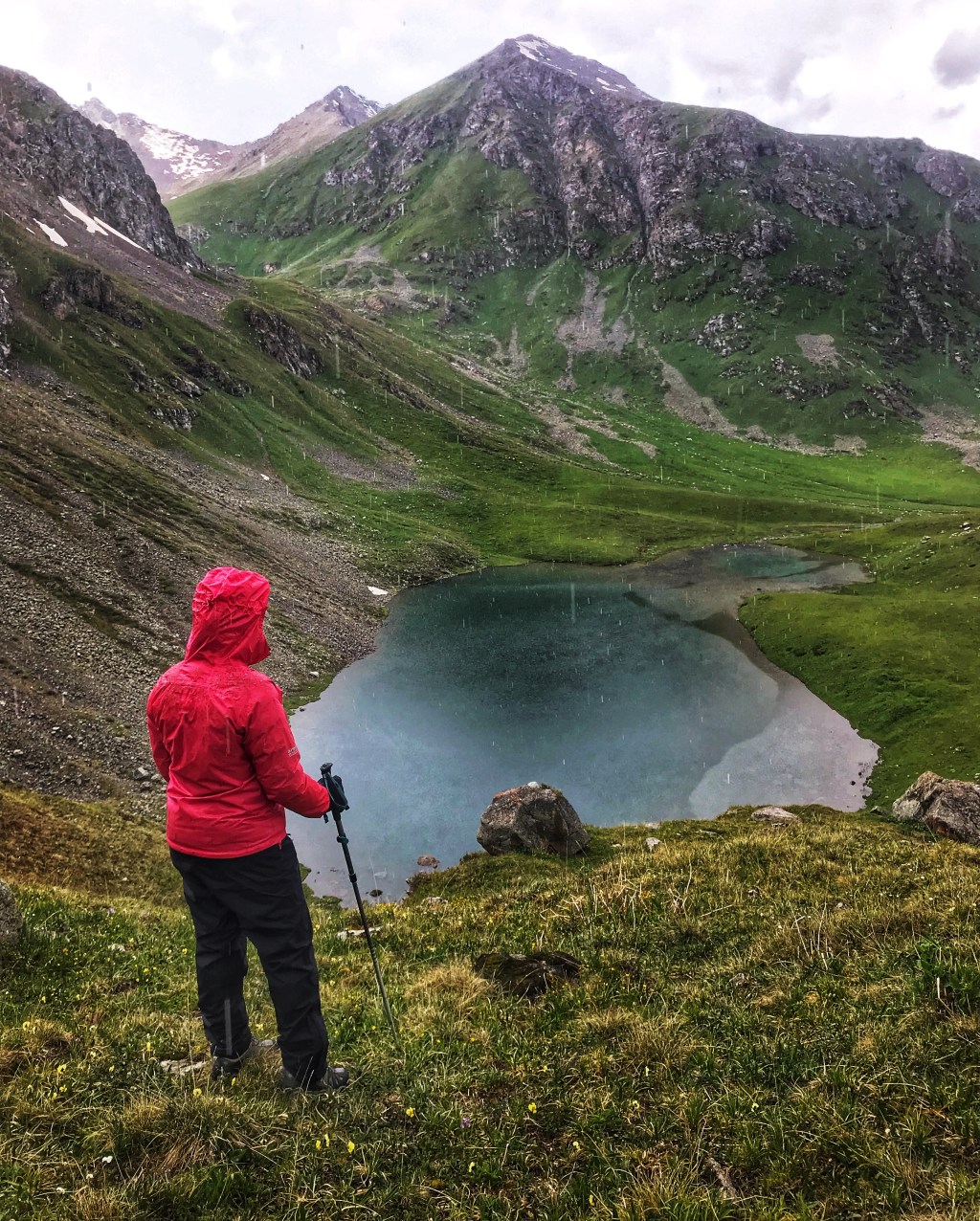 Urmat tells us that the lake is just at the base of the mountain, and it’s a sight to behold when we finally crest the last ridge hiding it from our view. There just below us is the sort of greenish-blue alpine lake that makes a hiker’s heart flutter. We sit down for a rest and a snack before grabbing the cameras and heading to the shore for some pictures. We rockhop across the outlet stream to get closer to some rocks that should make a nice foreground subject, but, within a few minutes, the gray clouds that have been accumulating since we set out finally betray us.
