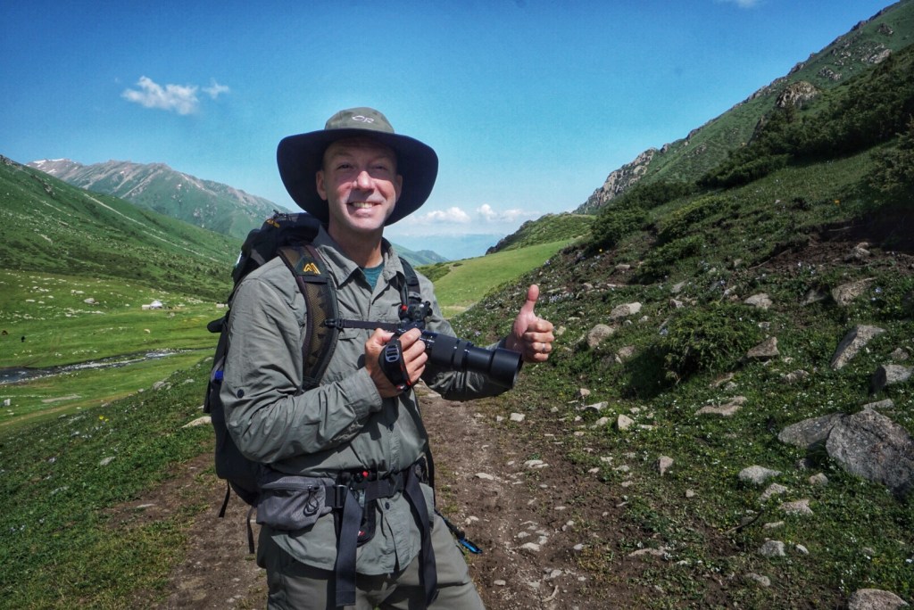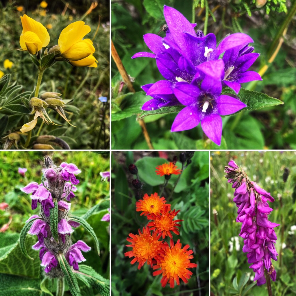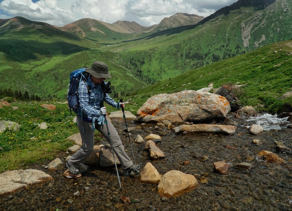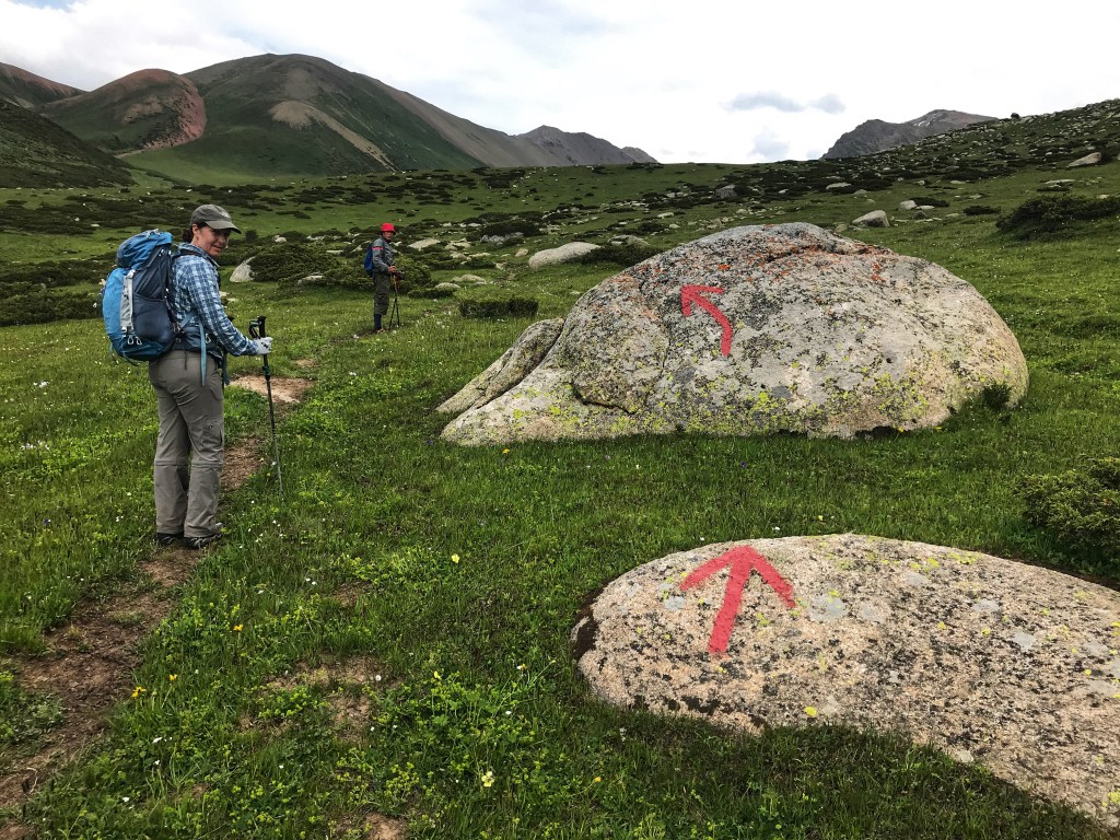 We climb steadily on a steep single-track trail through an ever impressive variety of wildflowers as our heart rate climbs, too. We see, in passing, a Lammergeier soaring high above, a kestrel hunting and a rose finch perched. The birds here in Kyrgyzstan are a fun distraction from the trail.