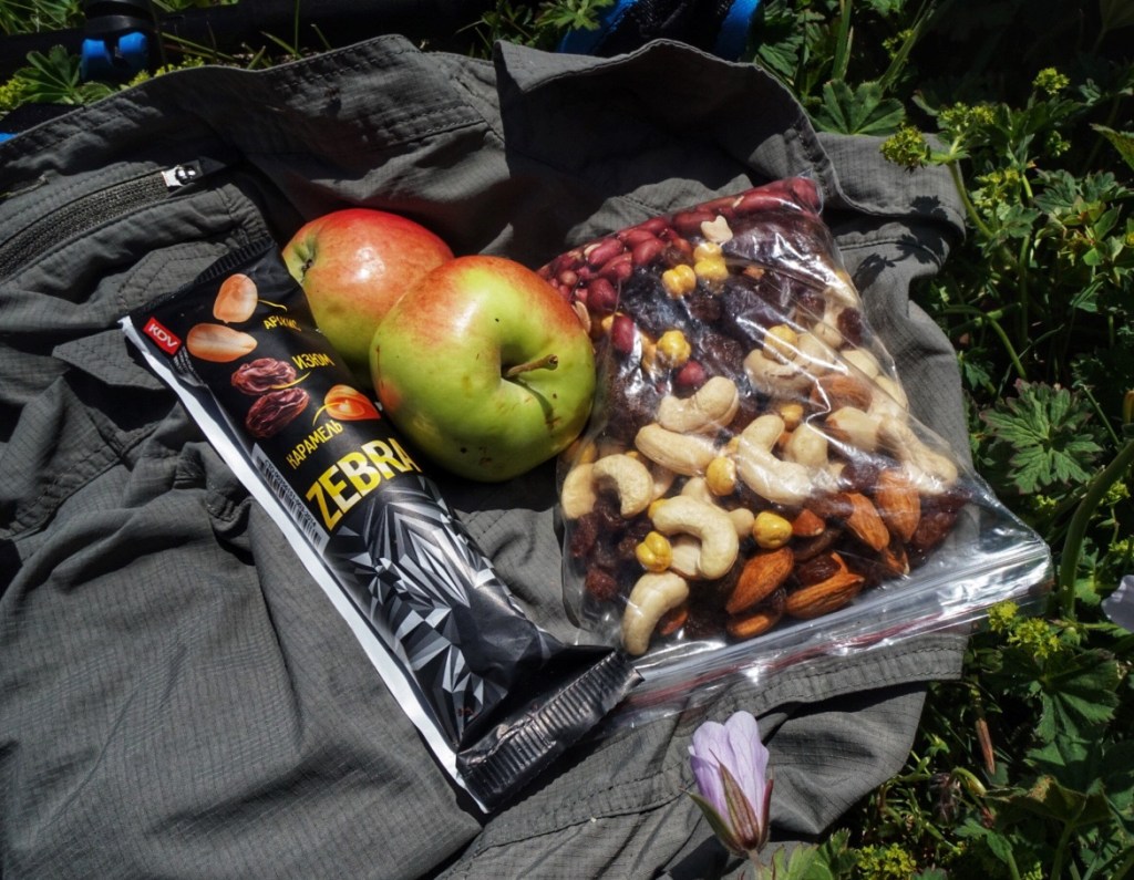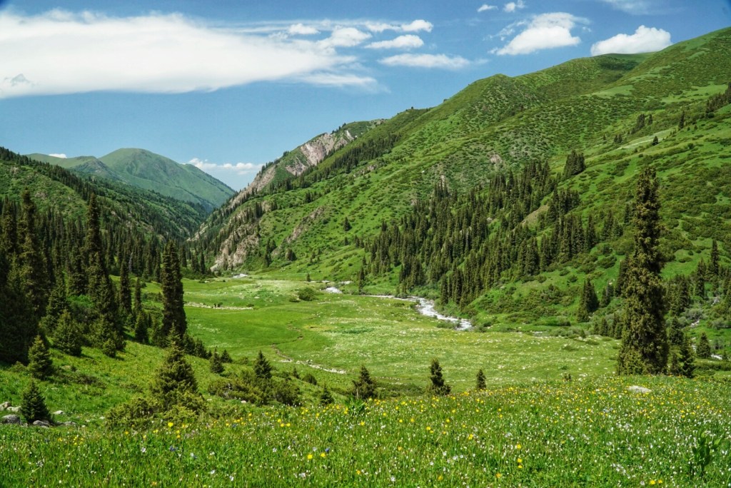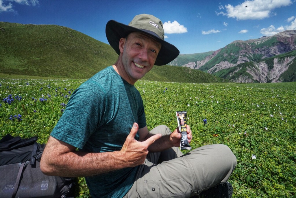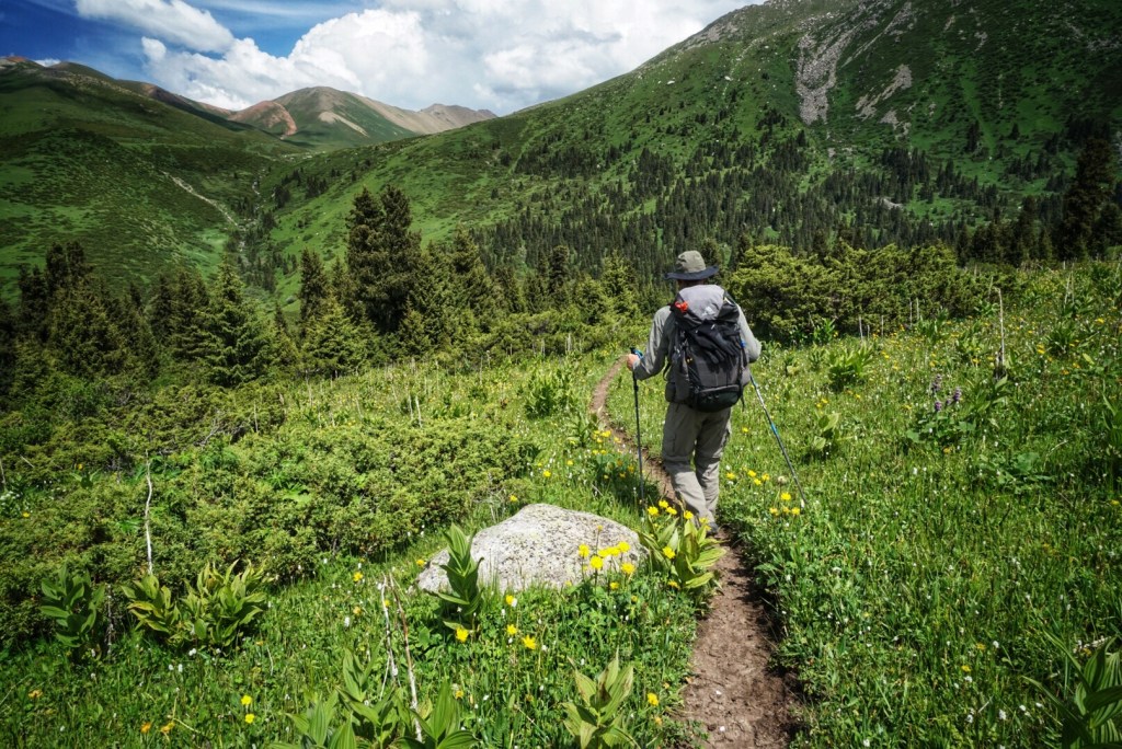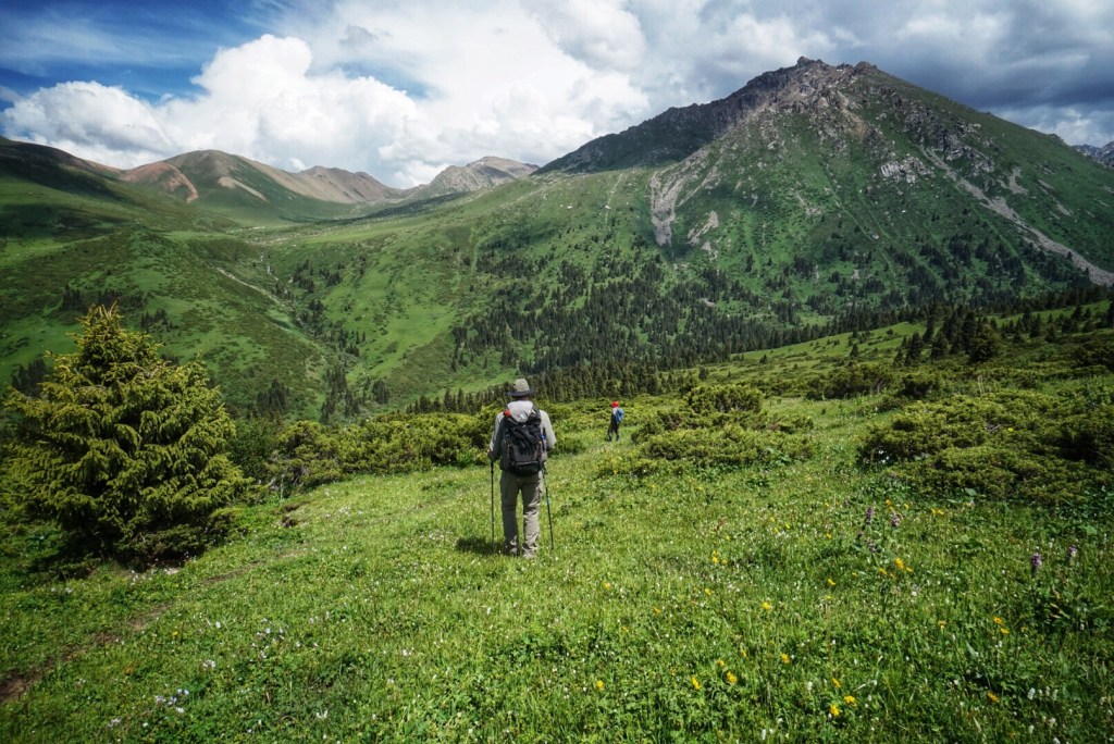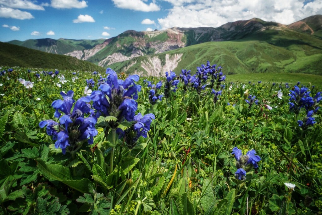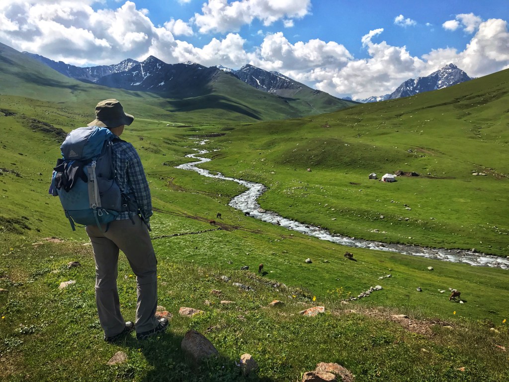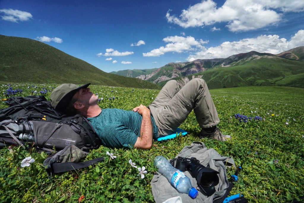 We head down another half hour, gawking at the expanse of green off to our right, before stopping for lunch in a beautiful flower-filled meadow overlooking the valley below. Lunch is simple and a bit repetitive—apple, nuts, and another Soviet energy bar. Folks here don’t really know what to make of a couple of crazy vegetarians, especially when they are surrounded by animals that produce meat for them. Alas, we came to Central Asia to hike, not to eat!