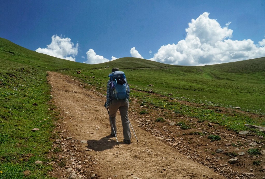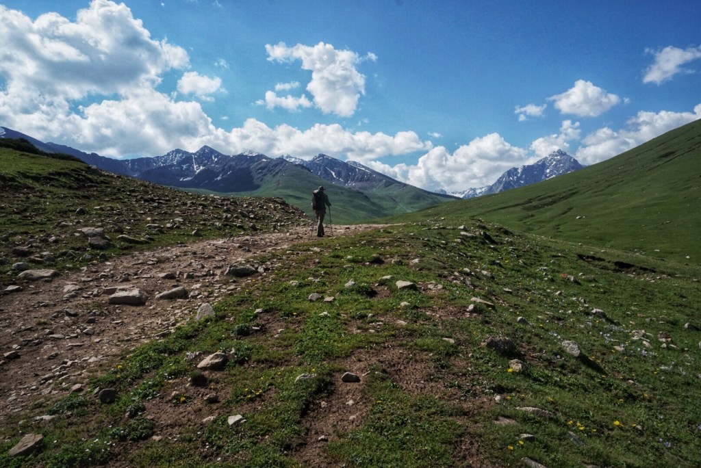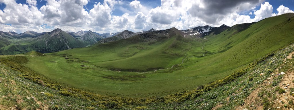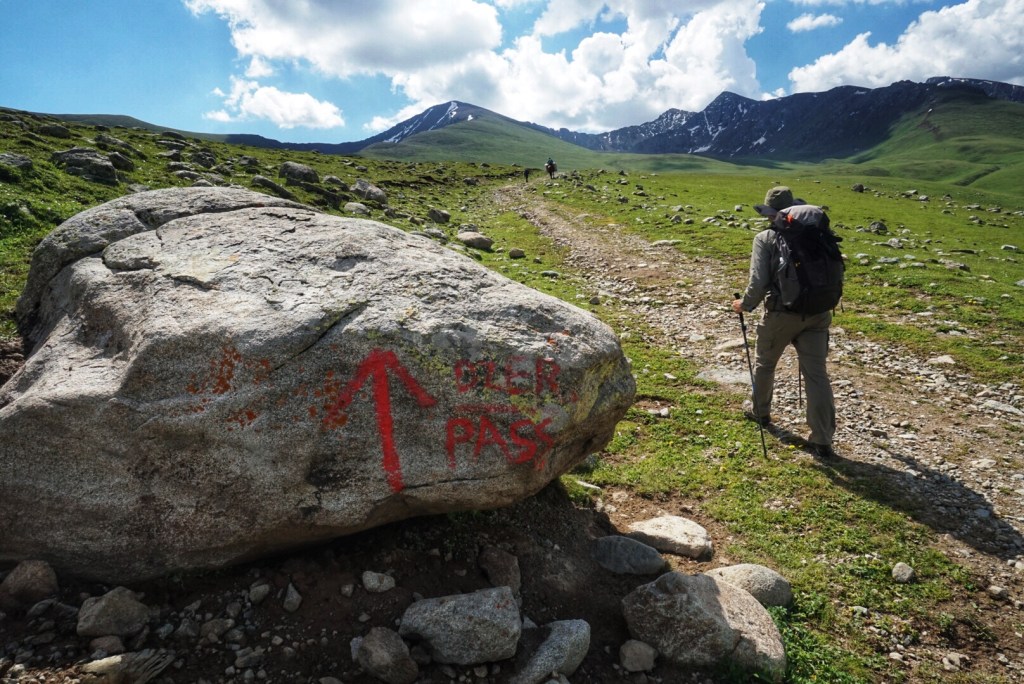 Soon our companions catch up to us, and we start hiking at a normal pace. Before long we turn the corner and say goodbye to this valley as we begin a steady climb up to Jyrgalan Pass, which is more of a saddle than an up-and-over.