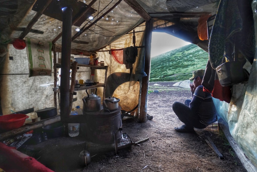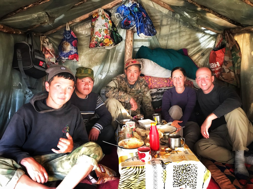 When we get back to the tent, Adis comes up to tell us that we are having dinner in the shepherd’s hut which is a special treat for us, not just because we may get a chance to learn more about the nomadic lifestyle but also because it’s really warm in there. They use a small wood-fired stove to cook on in a big cast iron wok-shaped pan. Then, they put a metal plate on top and use it as a base to heat pots of water for tea.
