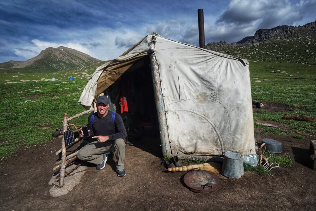 Just as we are about to begin the big climb, another man rides up on a horse with a foal and four dogs following him. He exchanges greetings with a gentle handshake, hops off his horse and walks and talks with Urmat as Adis jumps on his horse and leads Bob uphill toward camp.