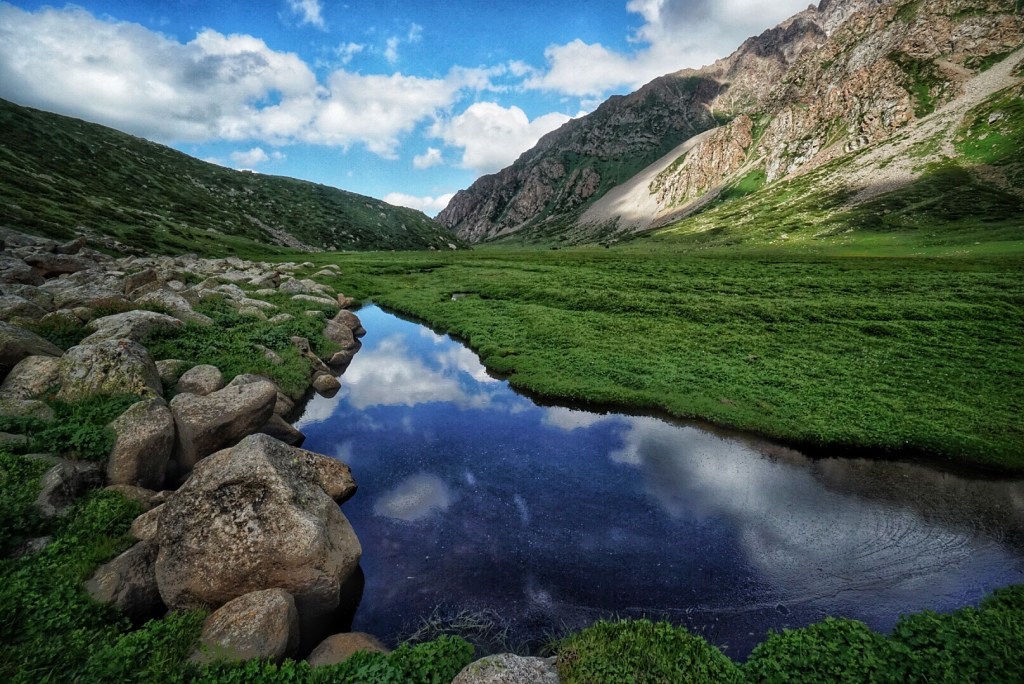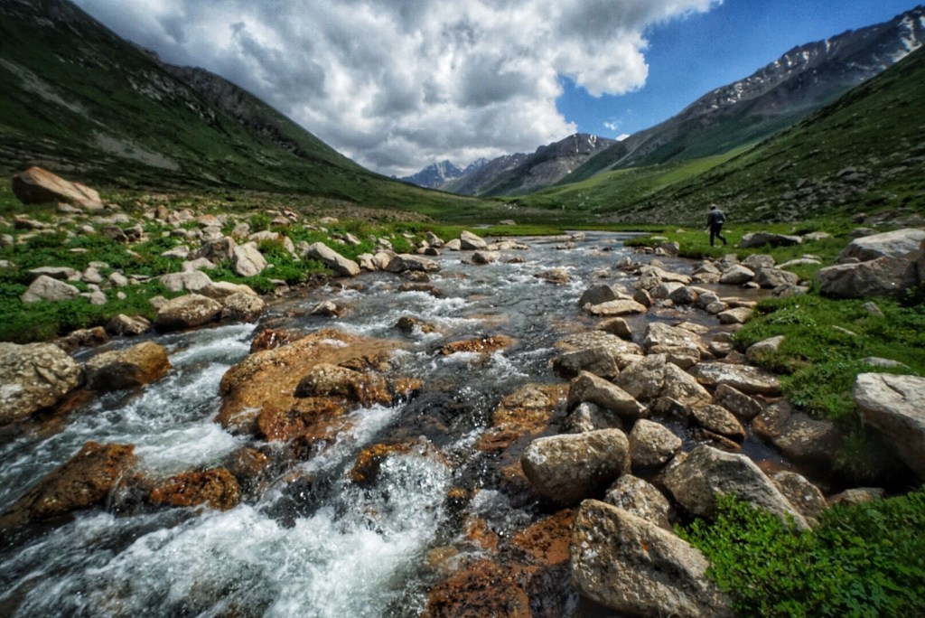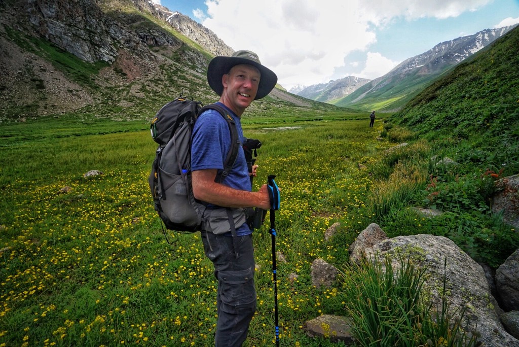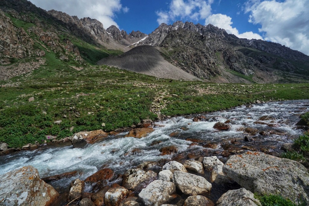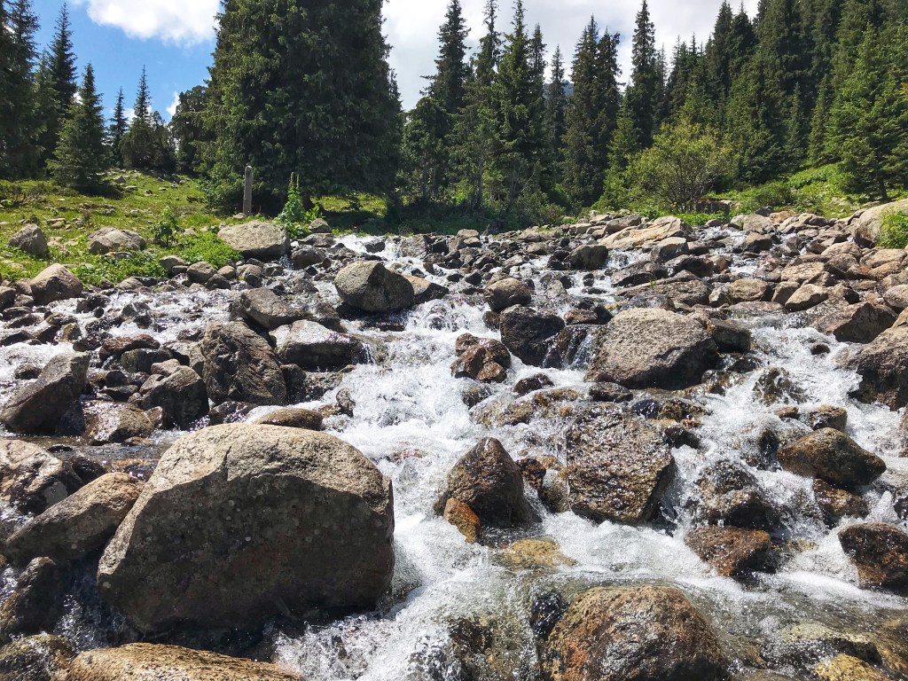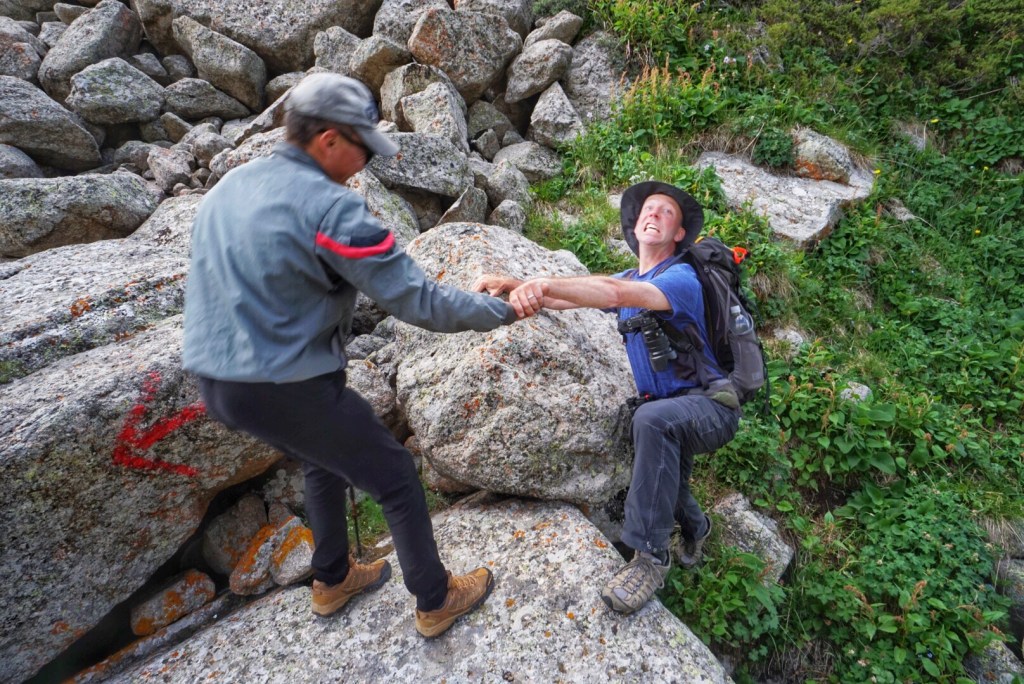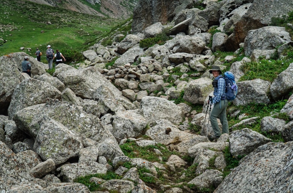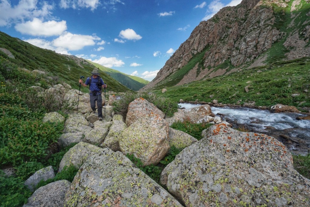 For the next half hour, we walk single-file, negotiating boulders and rocks as we make our way along the rushing river. Luckily, it’s not too challenging, except for one spot with difficult footing around a big boulder that requires a big stretch. Urmat is there waiting for us, taking our poles and pulling us up on to the rock. I nearly pull him over, but he is gracious and just laughs it off. He has an easier time with Matt, for sure.