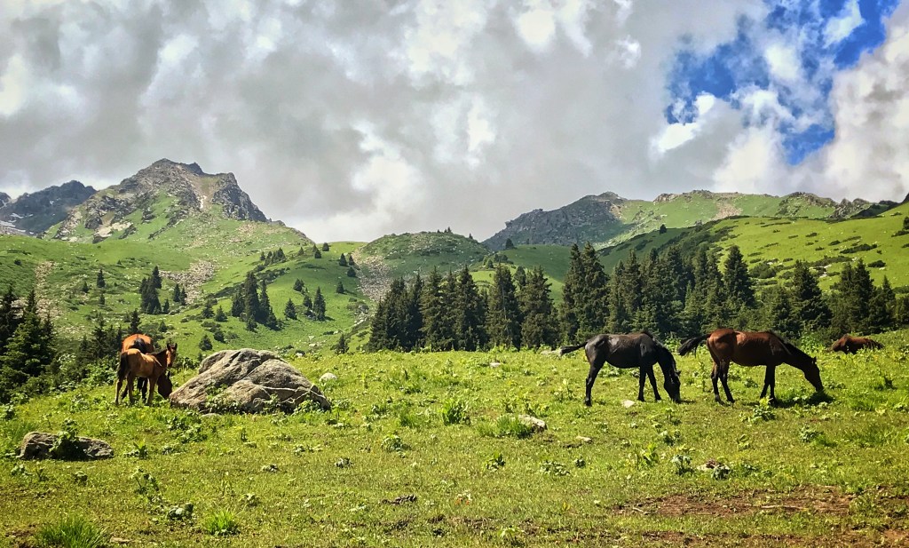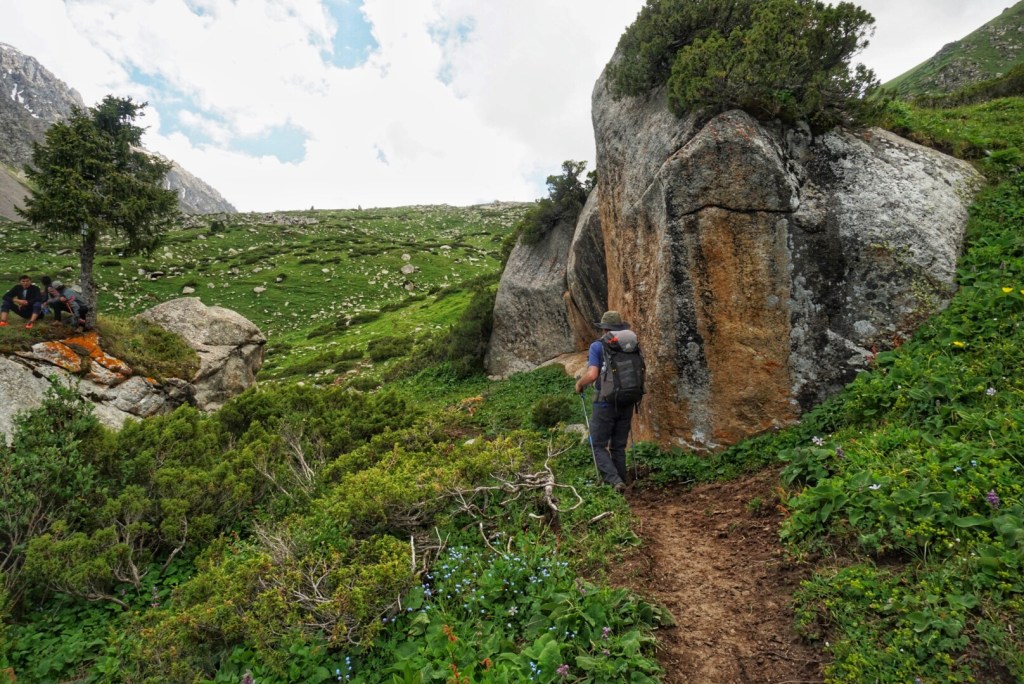 We continue on the dirt road/trail until it joins up with the lower trail, and we meet up with Urmat, Adis and the Germans’ guide and horseporter. We stop for lunch just after the trail junction where the Keskenkyia Loop and Boz-Uchuk trails split. The sky is looking a little ominous, so James encourages us to get going as soon as we are done eating. We have a rocky section of trail ahead, and he wants to make sure that we get through it before any rain comes to make it more challenging.