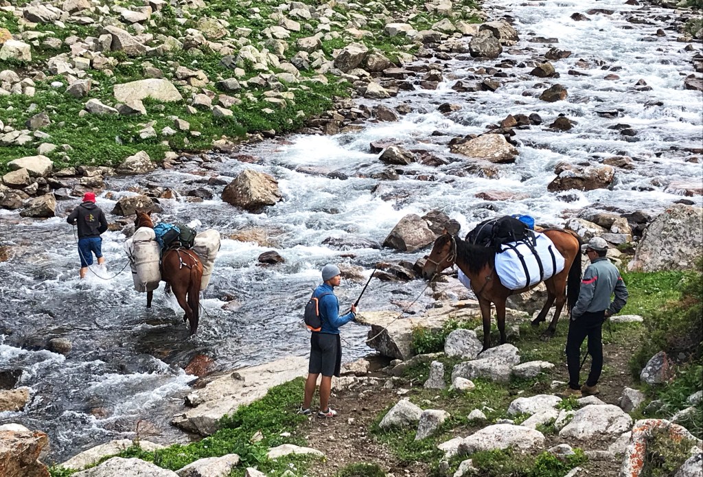 The horses are laden with gear, so Adis leads the way, fording the river by foot. Once he gets close enough to the opposite side, he suddenly picks up the pace, making a final leap to escape the freezing water. Seeing the painful expression on his face makes us all thankful that we get to continue our journey on this side of the river.