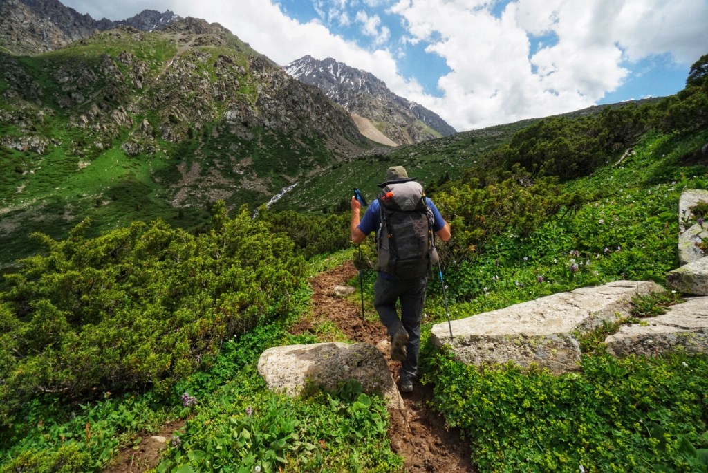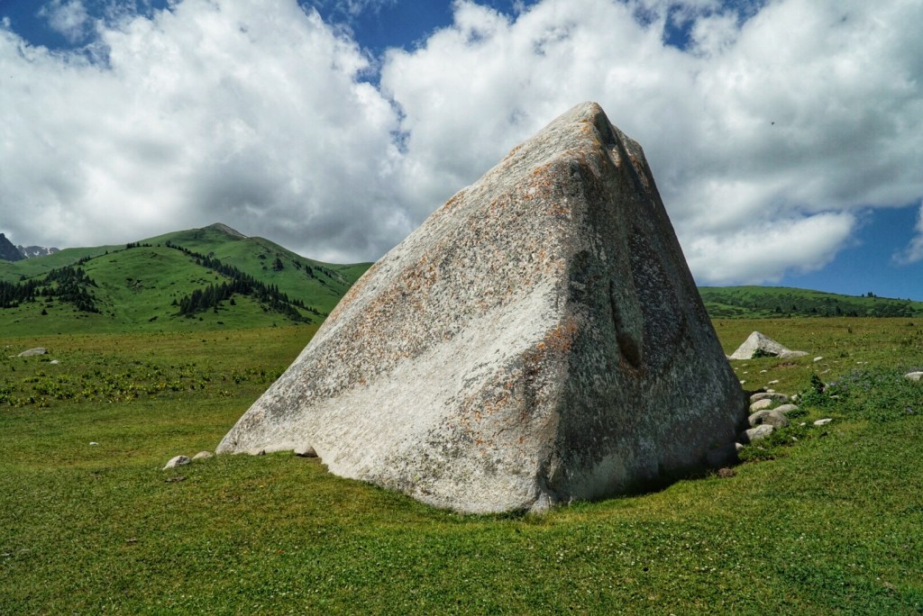 From there, we climb up towards the dirt road that takes us straight past the Tulpar-Tash Rock, one of Jyrgalan’s most famous sites. According to local legend, this is the place where the hero Manas took a stand against the invading Chinese. As the story goes, Manas rode his horse up the giant rock, scaring the Chinese away and saving the village. If you look closely, you can still see his horse’s footprints in the rock today.