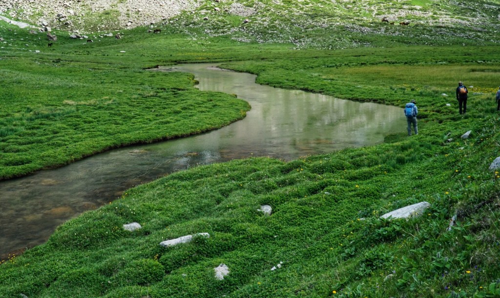 At the end of the rock section, we come to a marshy meadow with heaps of yellow wildflowers and wild onion growing alongside the gentle, winding stream. There are no rocks in the river here, and you can see clear to the bottom. It is flat and peaceful, and, if we didn’t know any better, we would swear that we were walking along the JMT in Northern California. What a scene! We are all in awe.