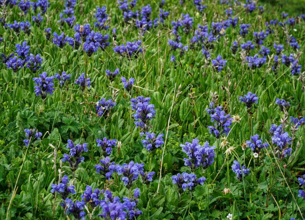 From here, we can see camp set up in a small, flat meadow beside the winding river. The final stretch of trail traverses a hillside that is covered in wildflowers. Colorful blooms carpet the hill above and cascade down below us. It feels like we are walking in the middle of a hanging garden. So beautiful!