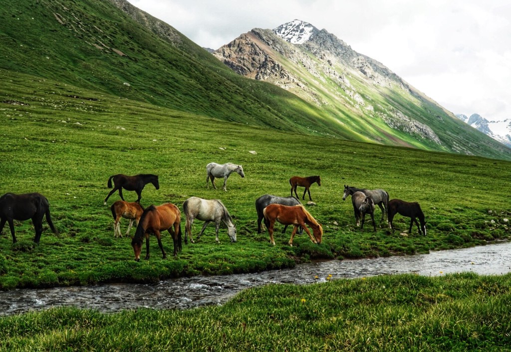As we get closer to camp, we see a large herd of horses spread out across the river. Urmat makes a loud whistling sound that catches the horse’s attention and draws them closer together. It’s impressive to watch.