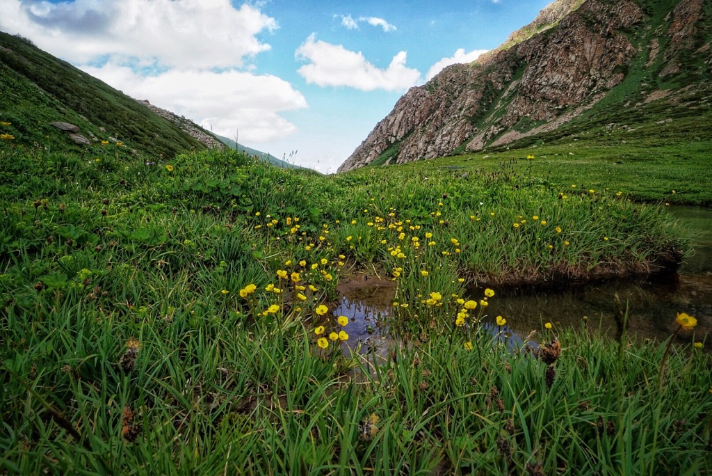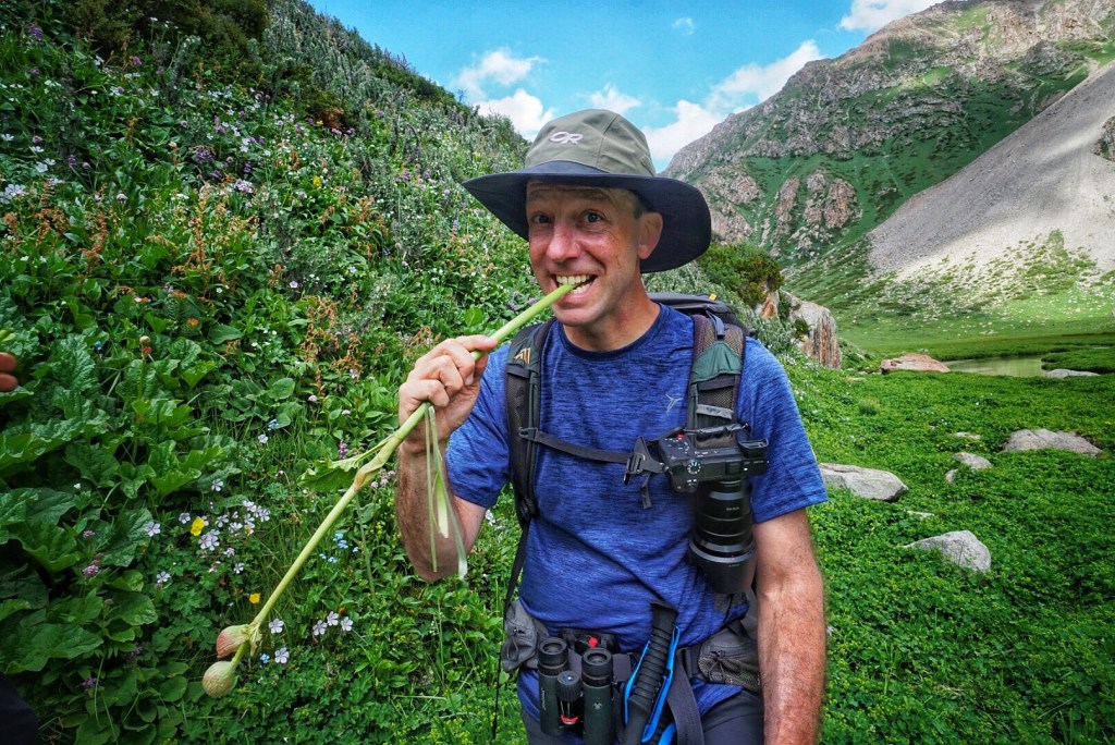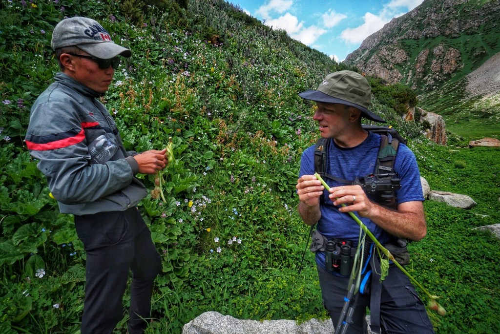 A bit farther along, Urmat finds some ishkun growing on a hillside, breaks off a stalk, peels the outer layer off and offers me a piece. It looks a bit like celery and tastes like green apple. It must be something close to rhubarb, and it’s pretty tasty. It’s definitely the closest thing that we’ve had to a green vegetable out on the trail where carbs and starches seem to reign supreme. We pick some more and stash them in my backpack for eating later at camp.