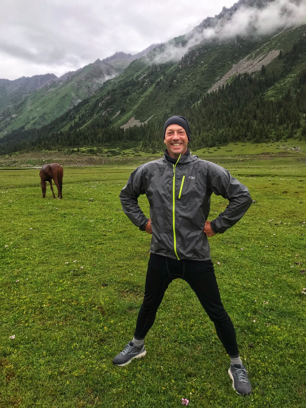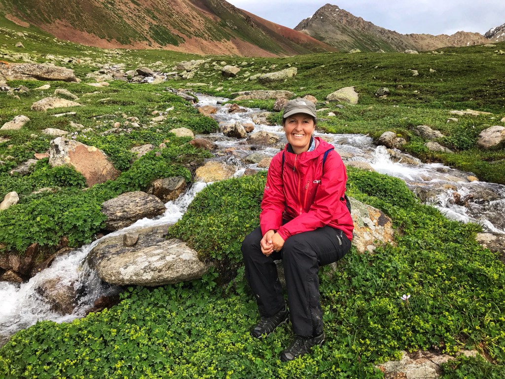We grab our backpacks and follow after them, intently watching to see how Bob handles the cold, deep, swift-moving water. Urmat takes off from a little spit of land, but the water gets deep just a few steps into the river. Bob soldiers on but clearly has to work hard to fight the current in the middle. The water is up to his belly now, and he jerks his head back, eyes wild and panicked from the freezing temperature of the water. We breathe a sigh of relief when his body starts to rise out of the river. There’s another little channel to cross, but this one has no current and only comes up to Bob’s shins, so it’s a piece of cake by comparison.