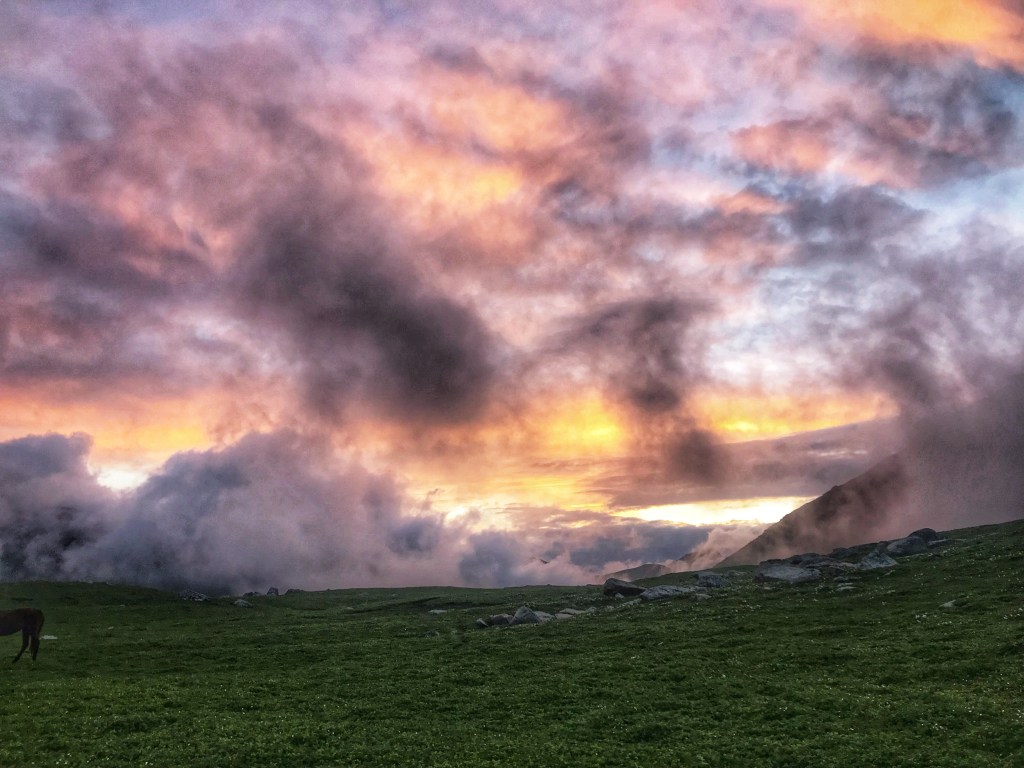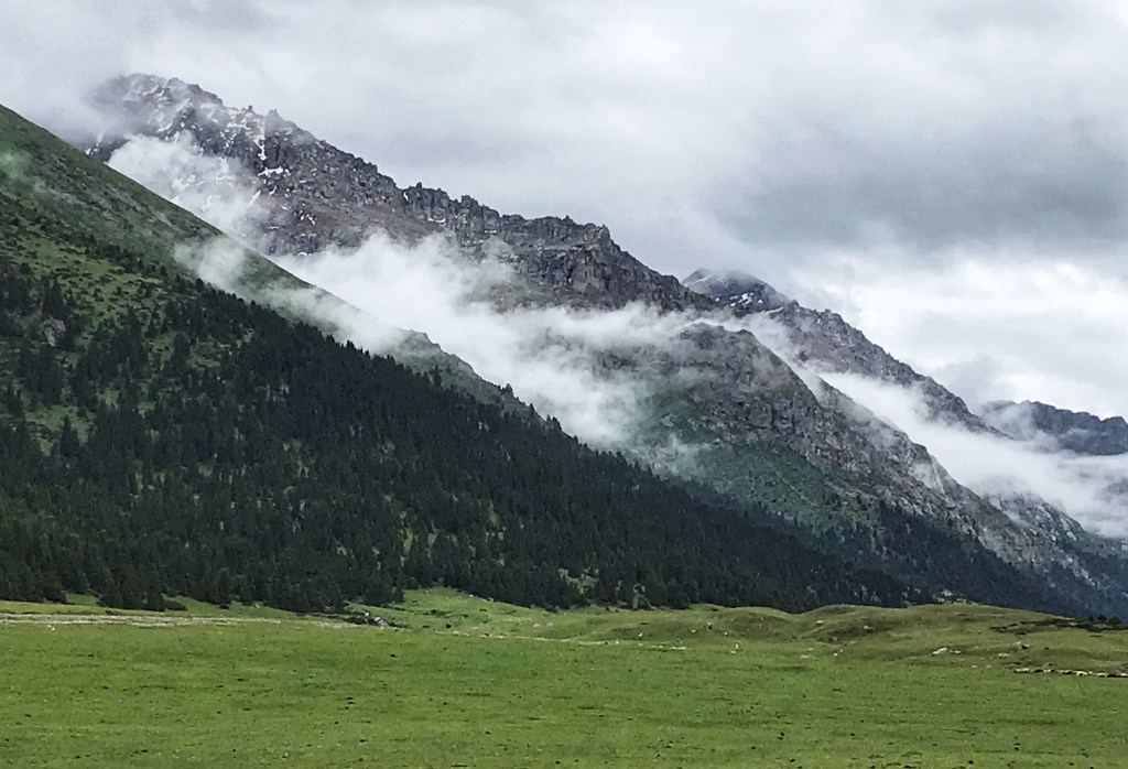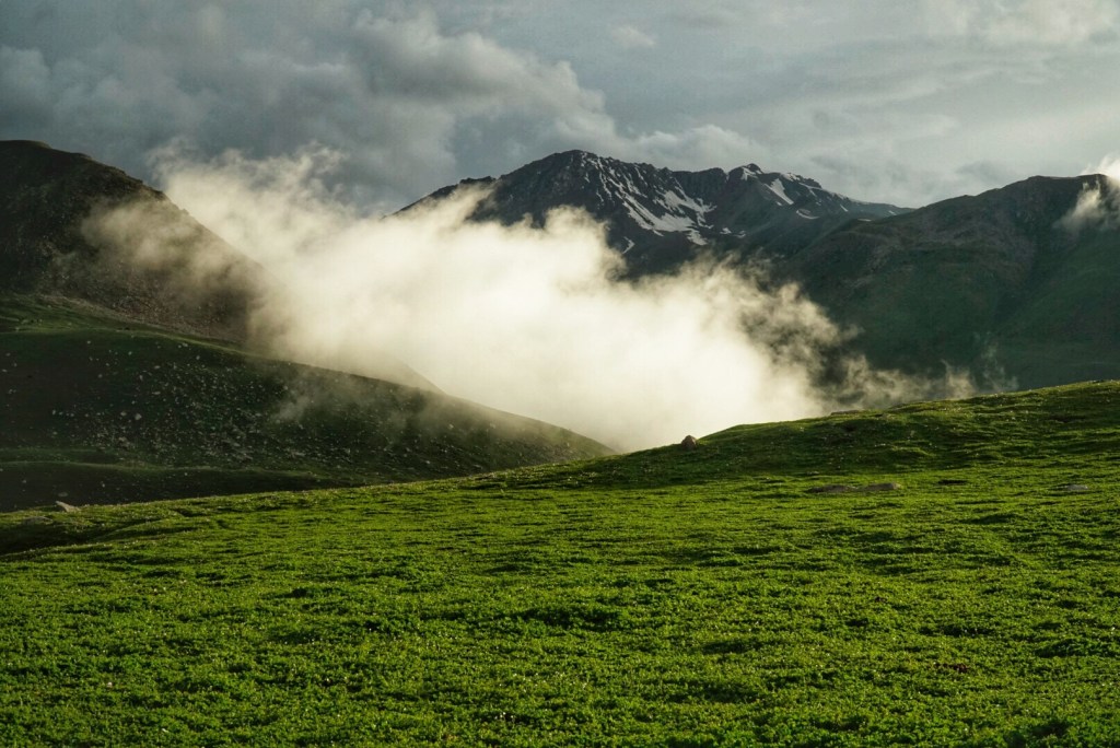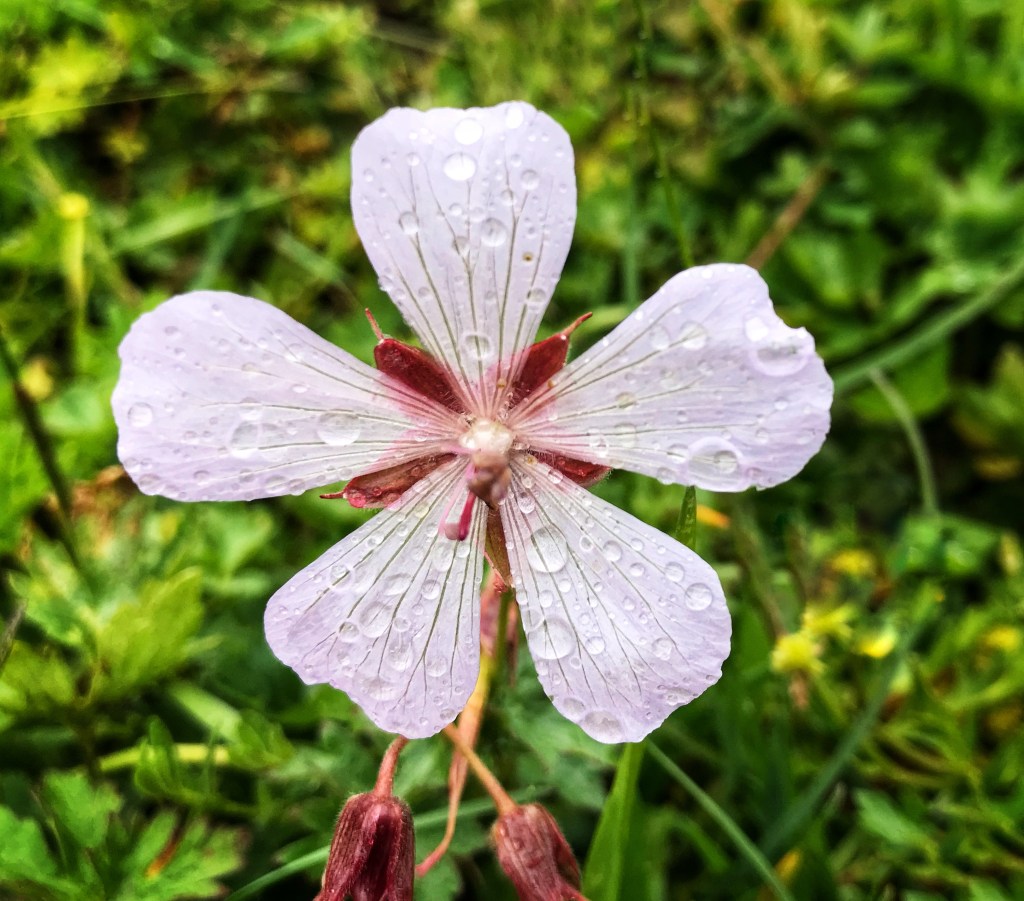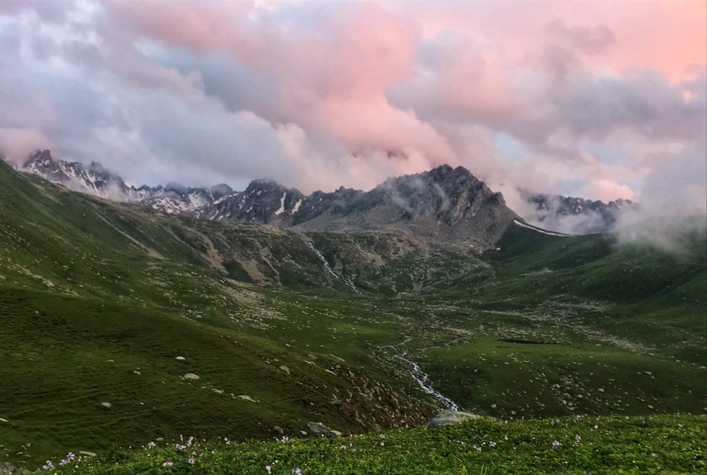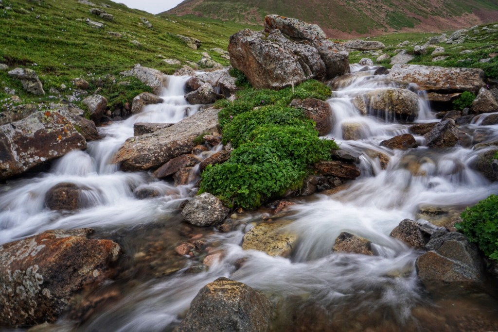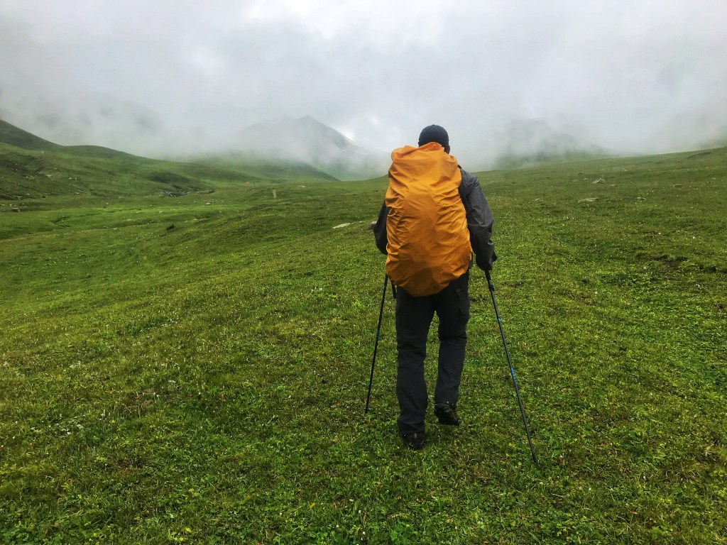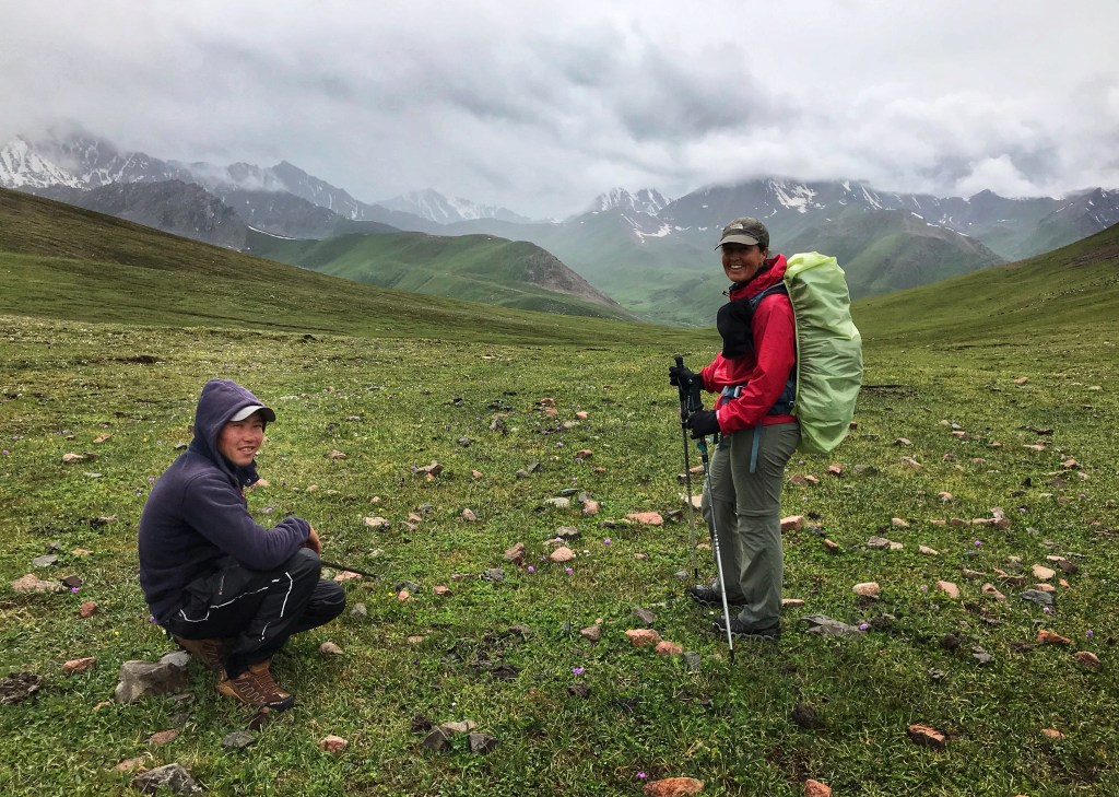 Eventually, the narrow muddy trail gives way to the open grassy jailoo that will take us up to Boz-Uchuk Pass. The grasses, flowers and small leafy shrubs here are drenched with rain, and soon our shoes and socks are soaked through.
