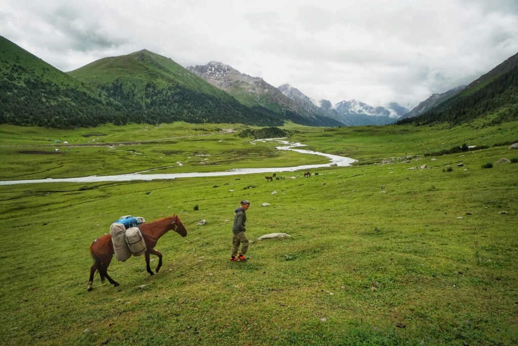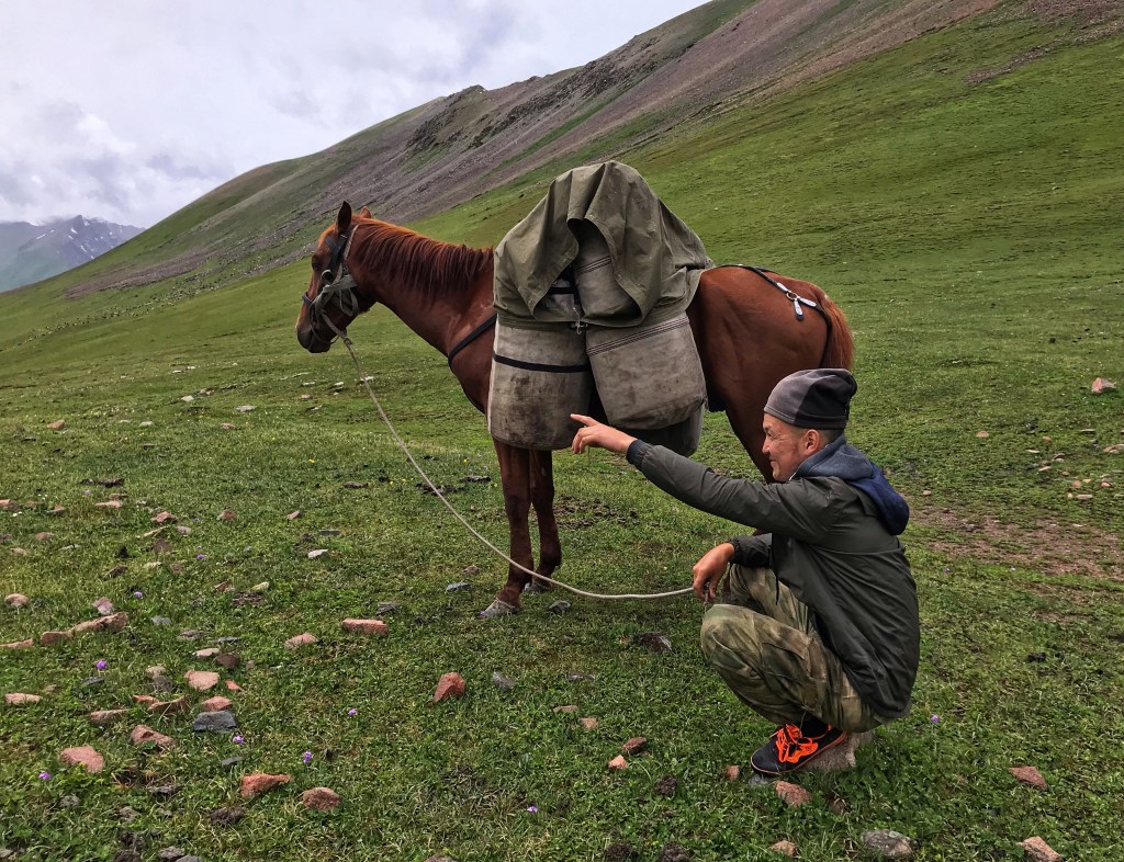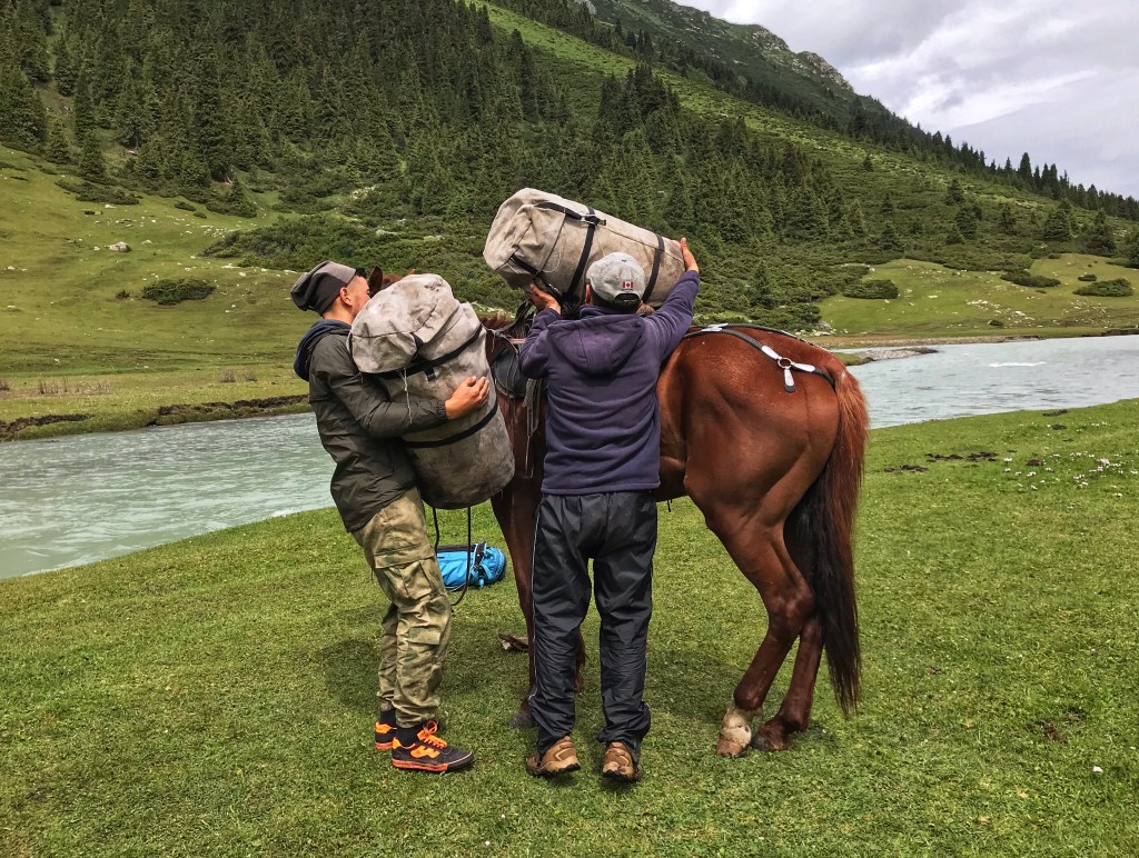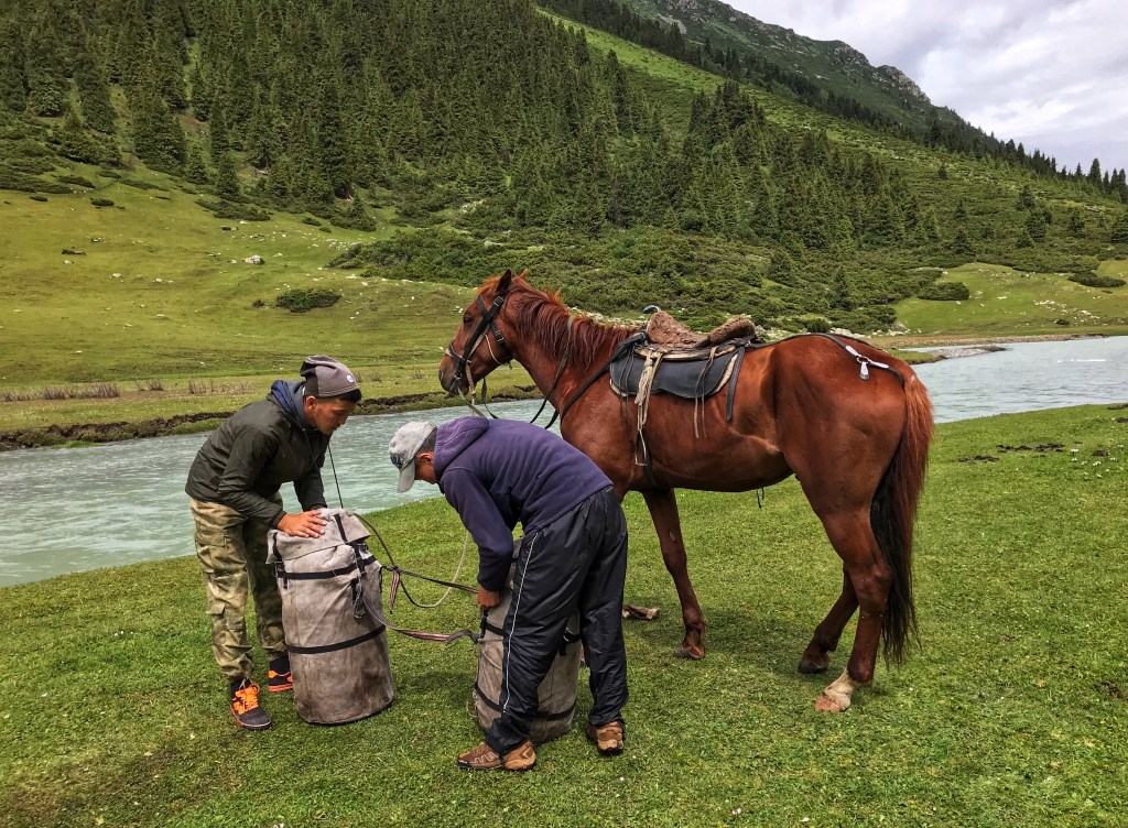 Safely on the other side of the river, Urmat jumps off Bob’s back, unloads the gear bags and crosses the river again. He trots Bob downstream to our campsite and picks up the remaining two gear bags. These two are a little bigger than the first, and the bottoms of them get submerged on this trip across the river.