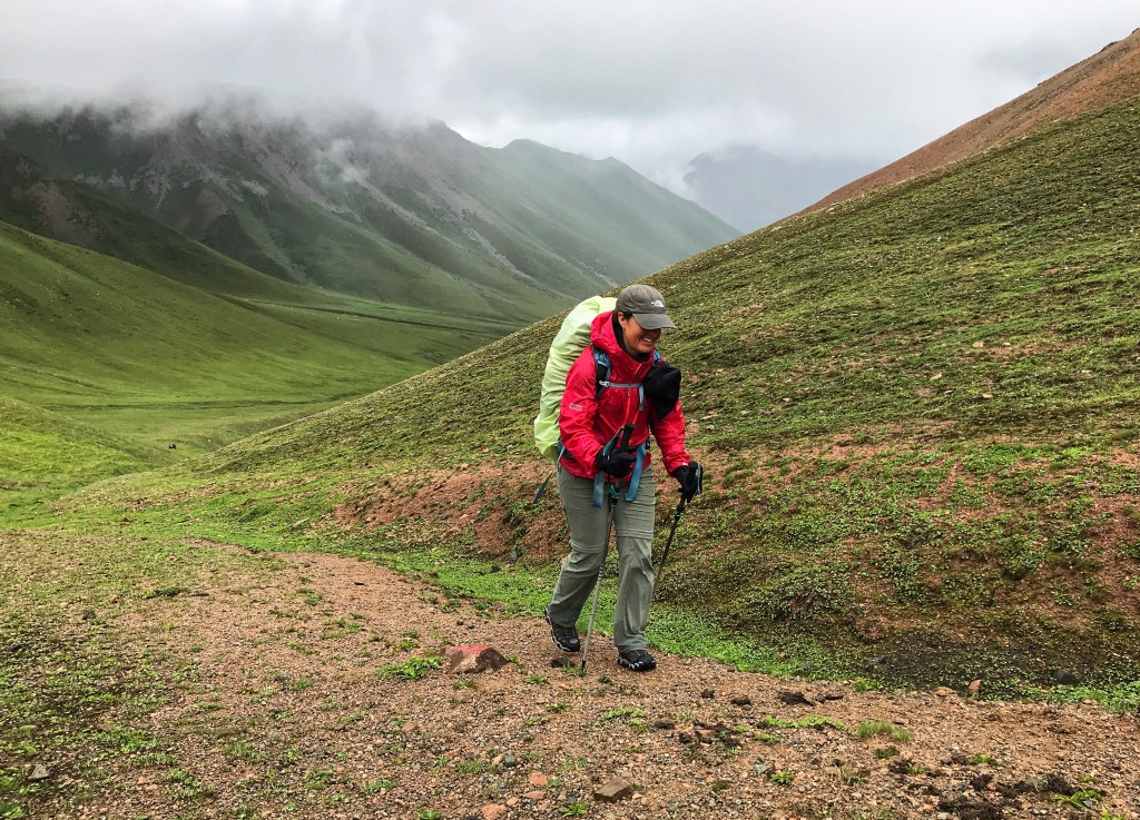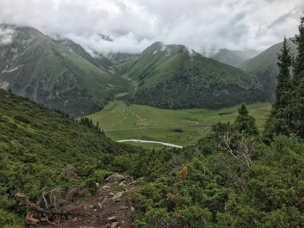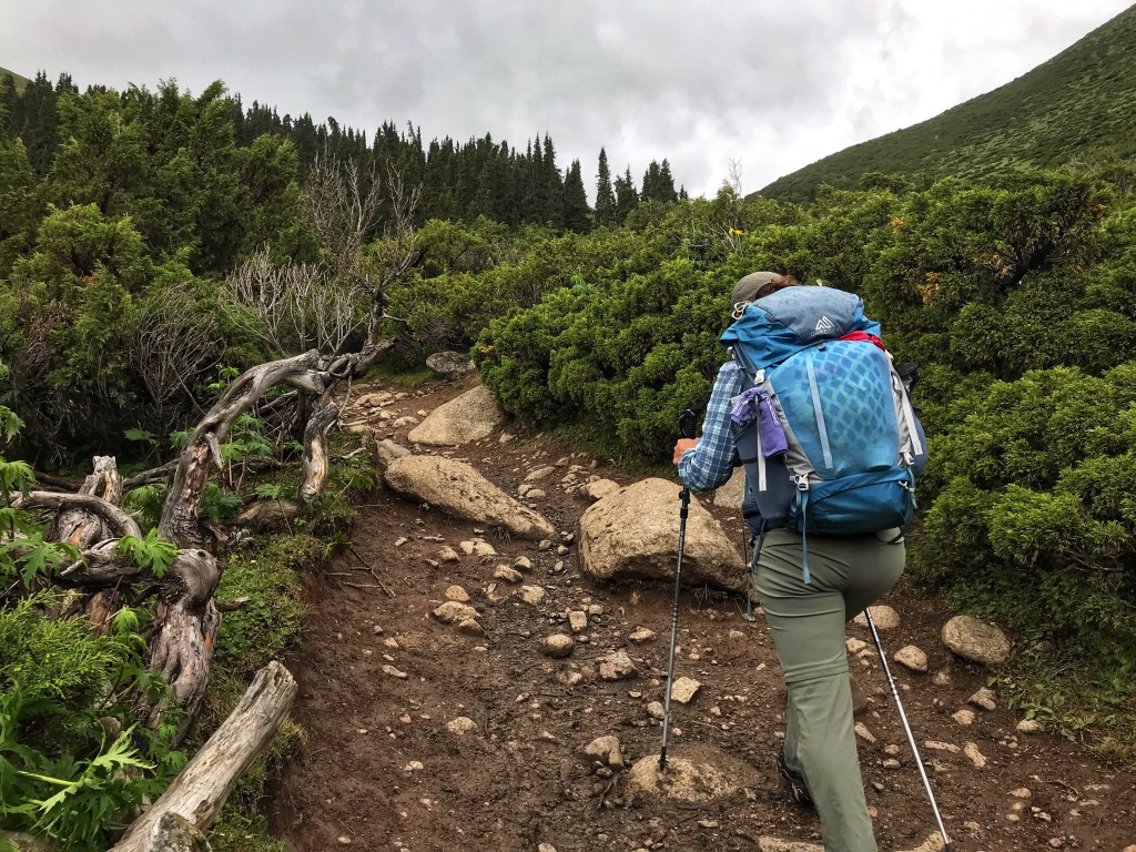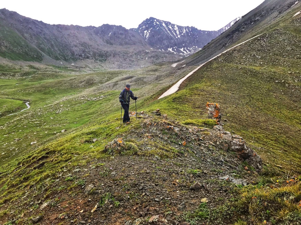The ascent here is much more gradual than the steep trail we took up from the river, but I find it almost more difficult and tiring. It’s on a slight tilt that has us always leaning to our right to compensate. Mentally, I find that I gear up for the tough climbs and let my guard down when the trail seems like it should be easier. This lopsided jailoo is toying with me today.