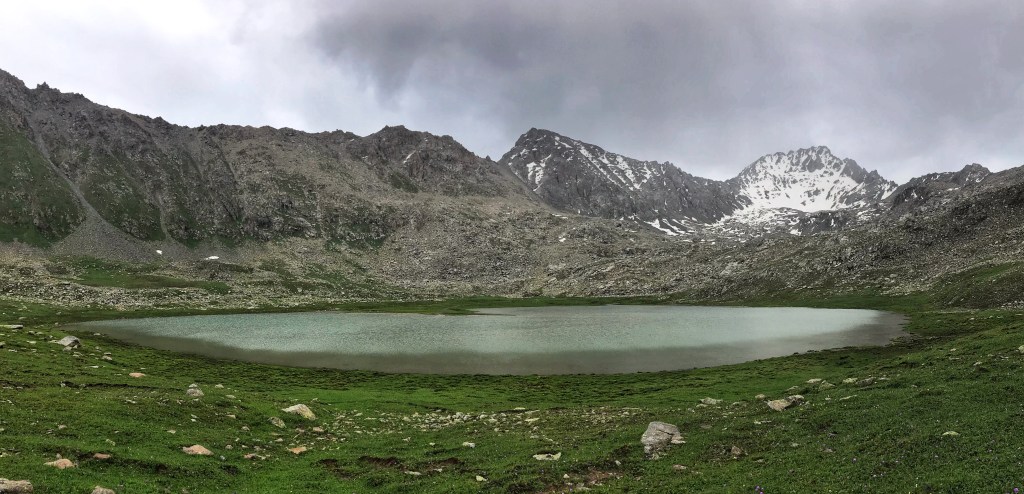 We had been thinking that we were going to camp further on, closer to the Boz-Uchuk Lakes, so we are a little surprised. We pull out the map to consult. We point to the lakes, but Urmat tells us that getting to the lakes crosses terrain too difficult for a horse and that it is too wet and marshy for camping up there. The spot we are currently at is near running water and is far better as far as they are concerned. We decide to go with it and help set up the tents in the wet meadow just as the rain starts up again. We take the opportunity to rest for a bit but pack up our super light backpacks for a late afternoon hike to one of the three lakes in shooting distance from our camp.