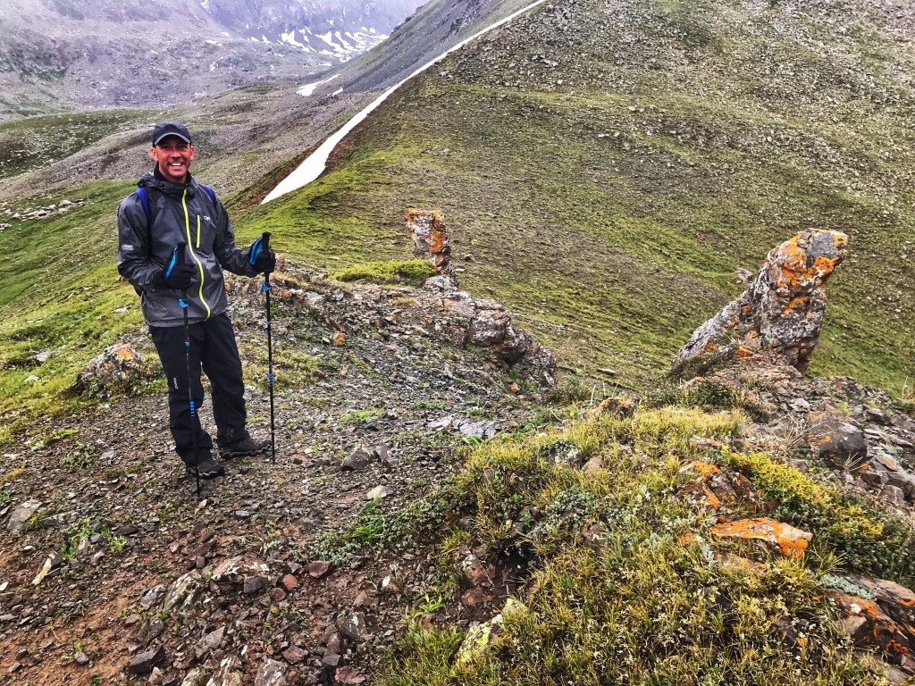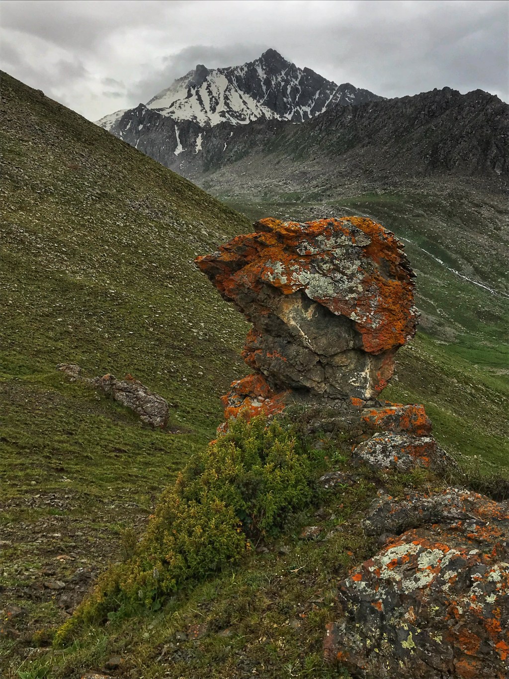 We pretty much tag the lake and turn around, but we decide to hike up to a ridge on the way back, primarily so we can spend some more time out of the tent and keep moving on this rainy day. We contour up the hillside and boulder hop our way up above the valley to a rocky prominotory where we can see across the jailoo to our campsite and down into the Boz-Uchuk Valley. The rain finally lets up as we make our way down to our campsite.