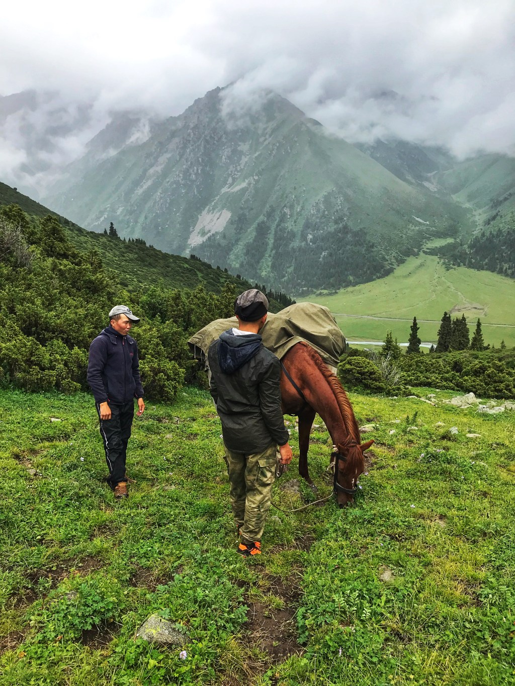 It’s a good challenge for us, but it’s even tougher for Adis and Bob, whose hooves have a difficult time on the slippery mud. We are ahead of them, but Urmat pauses every few minutes to see if Adis needs any help rearranging the bags on Bob’s back. Guiding a horse up a steep slope like this must be exhausting. Every time Adis stops to take a break, he doubles over fighting to catch his breath. These guys are really earning their pay today!