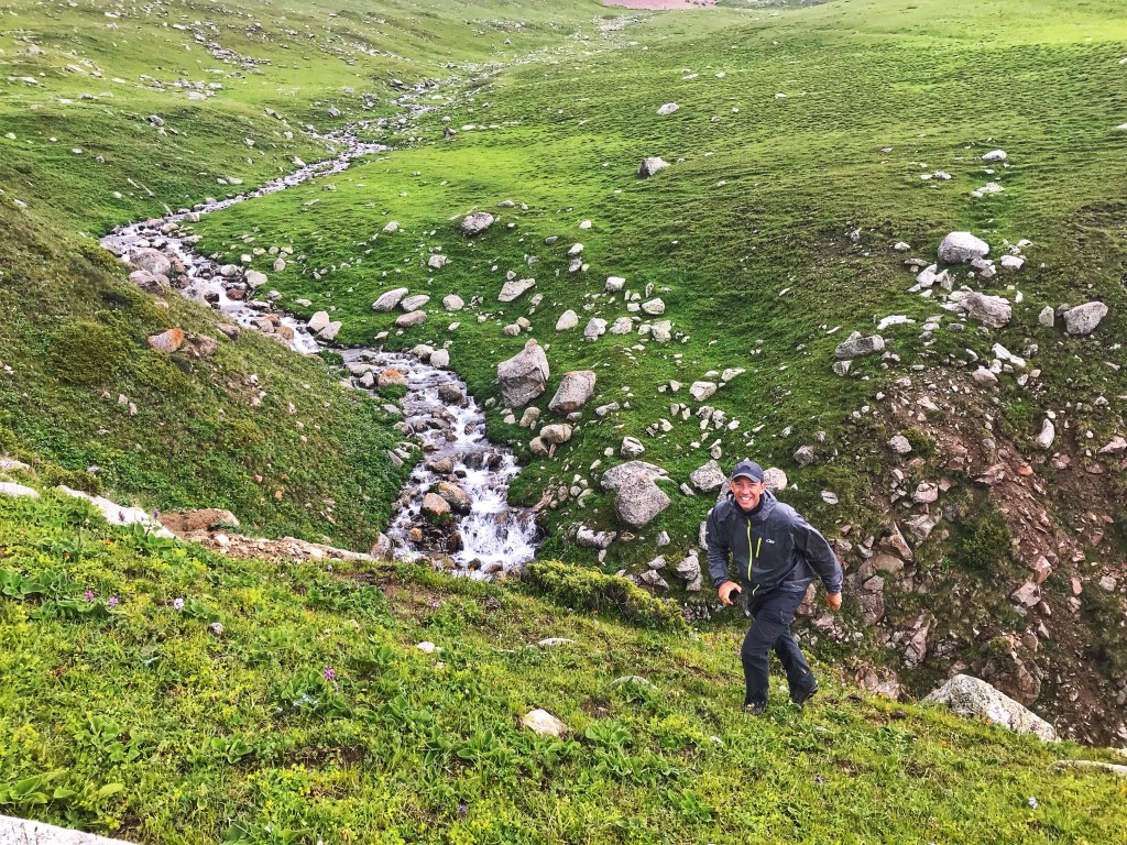 The trail now begins to get steeper and more straight-forward as we make our way up to the Boz-Uchik Pass at just over 11,000 feet. This one is more of an up and over with no huge rock cairn to mark the milestone. Someone has spelled out the word Jyrgalan in Kyrgyz using rocks on the ground, but, other than that, there’s not much to see.