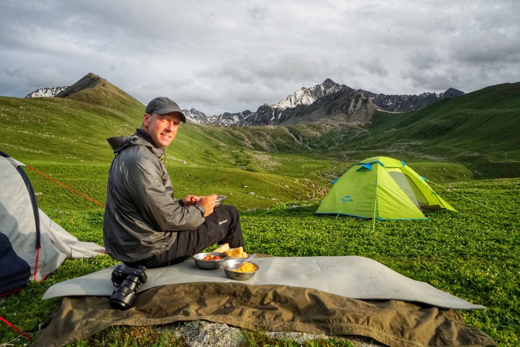 Matt finally wakes up at 7. His air mattress has been leaking since we arrived in Kyrgyzstan, and it has completely deflated, even with blowing it up twice during the night. Back at the guesthouse in Jyrgalan he did his best to find the leak by submerging it in a tub of water and looking for air bubbles, but he didn’t have any success in finding it. Now it’s gotten even worse, and there’s not much he can do out here in the field.