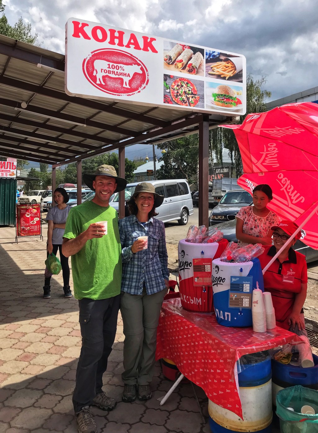 Outside we decide to try the two drinks we’ve seen hawked on the corners in Bishkek and other towns—maksym is a fermented wheat drink that’s slightly fizzy and, well, wheaty; chalap is a yogurt drink that’s slightly sour and slightly sweet. Both are interesting, but better when mixed together, according to Farkhat, so we try that as well.