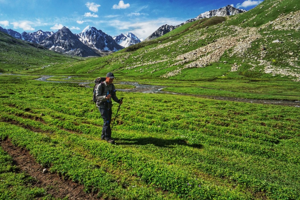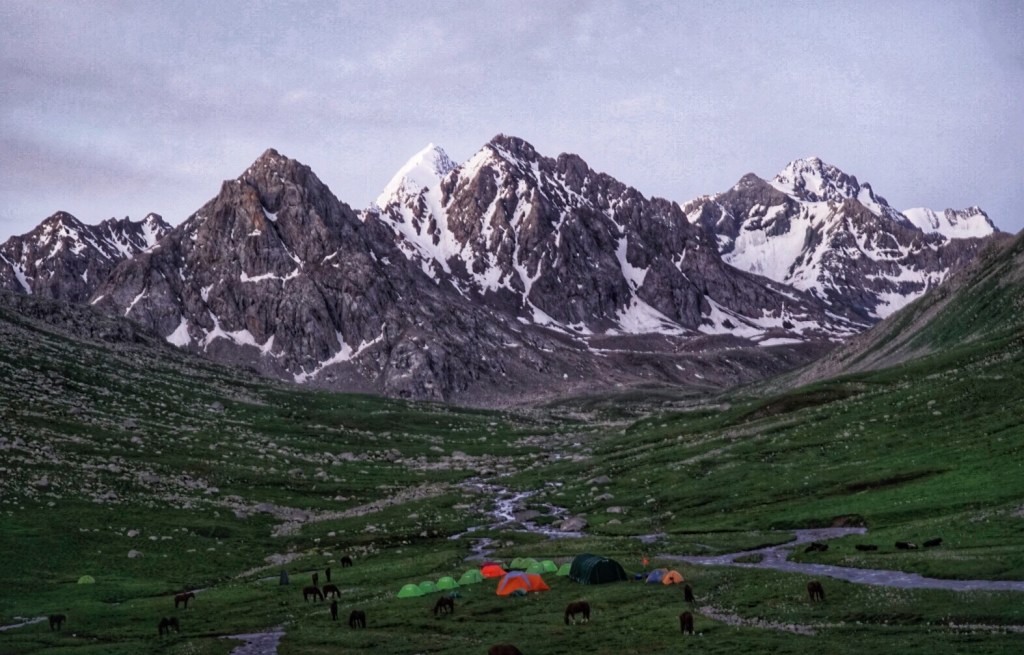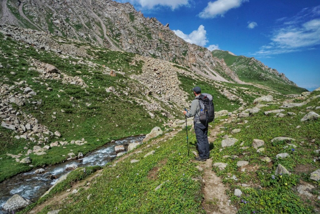 The scene actually gets more impressive an hour or so later when we are packing up. We catch the first light on the snow-capped peak of Tashtambek and the wall of mountains standing guard at the end of the valley. We eat breakfast enjoying this view and watch with curiosity as the South Korean hiking group breaks down their massive group camp to move onto their next destination. We wish them well on their trek, but we are quite happy to be moving on in the opposite direction.