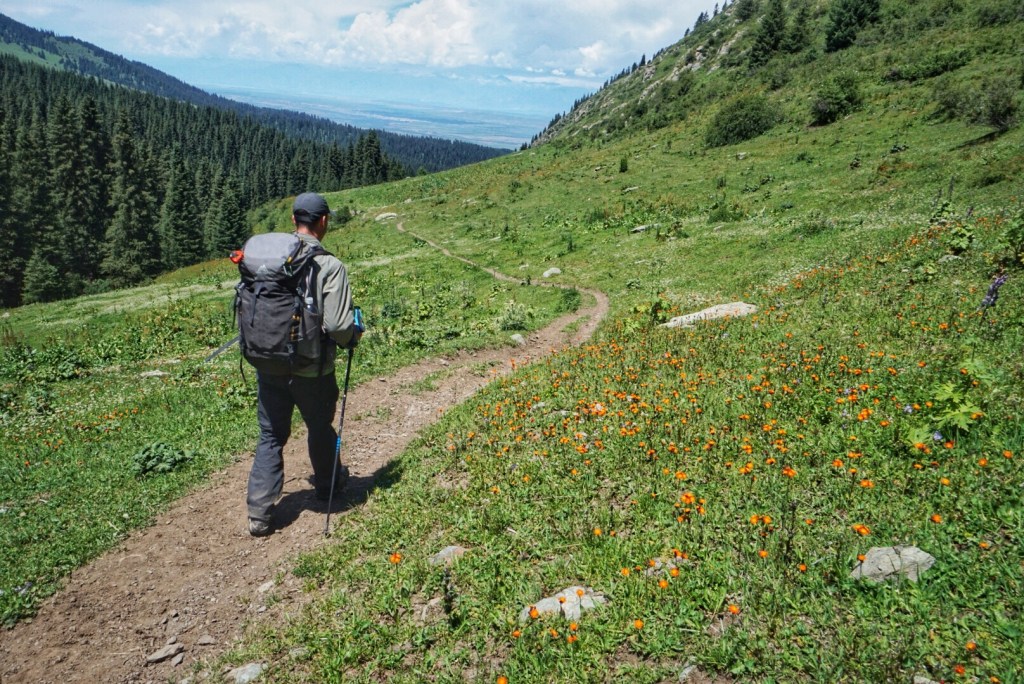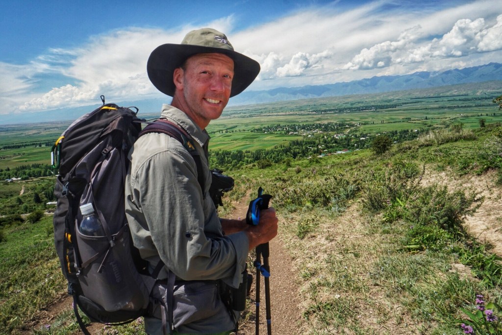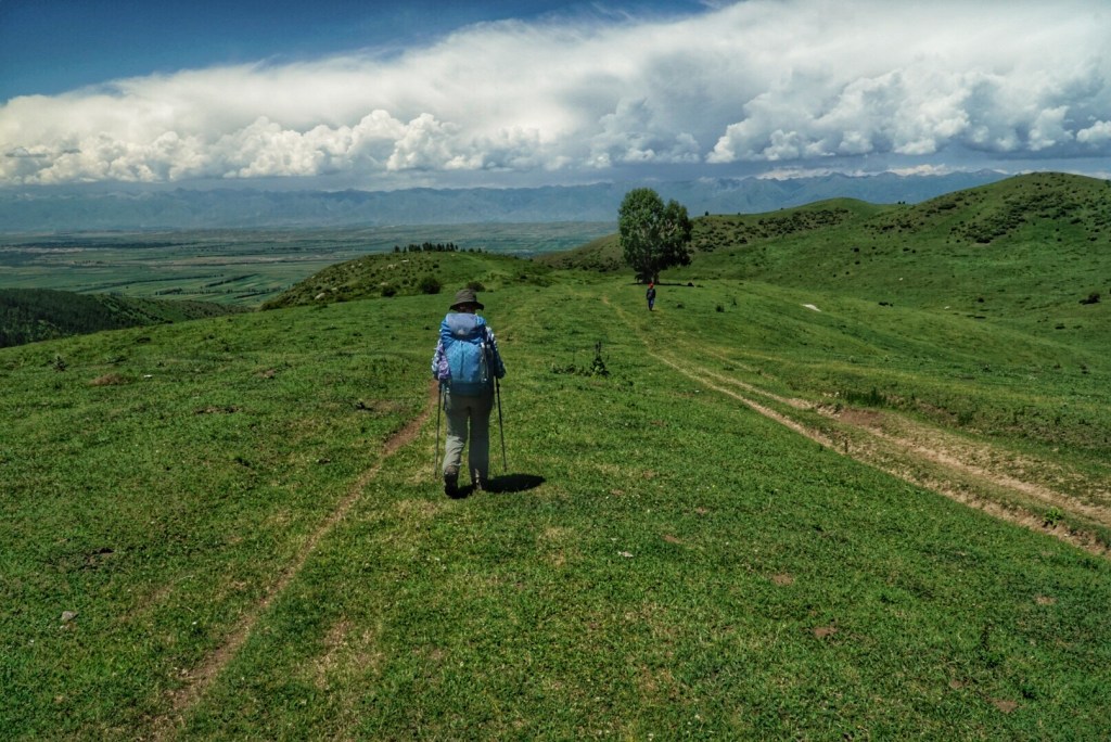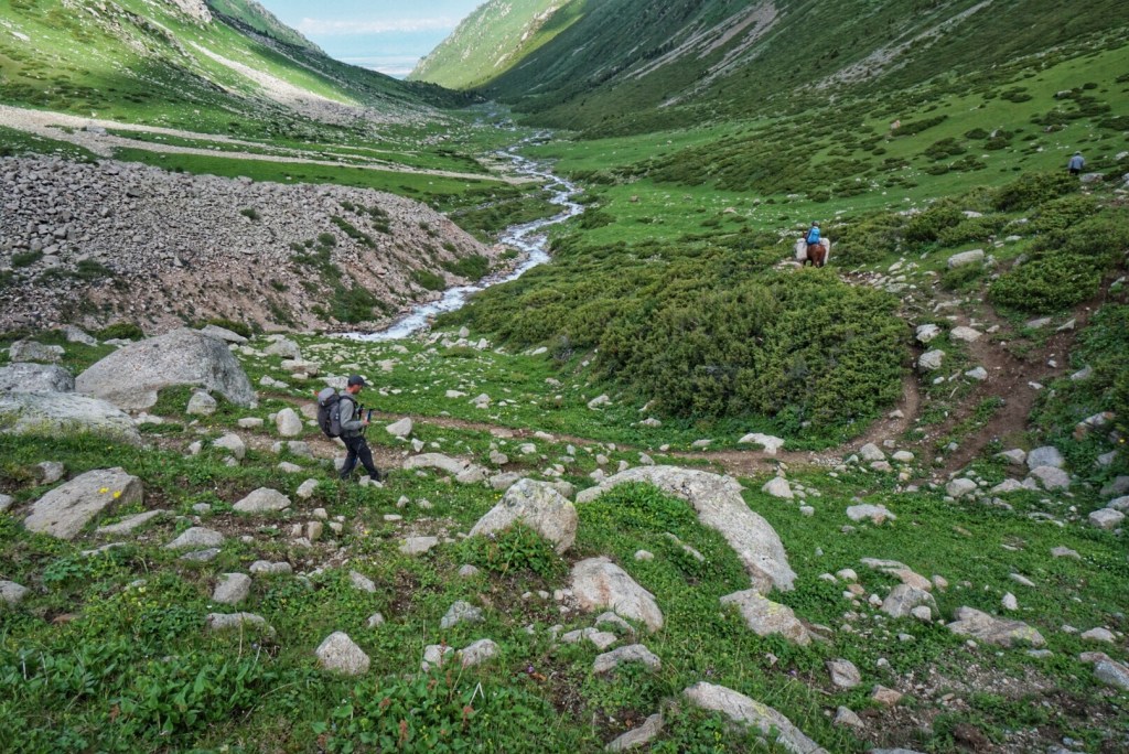 We have no idea how much walking we have to do today, but the trail is definitely playing with our heads. We figure we must be getting close when we finish with the jailoo. Surely, we’re almost there when we hit the open meadow. When we can see the deep blue of Lake Issyk Kol far off in the distance at the end of the valley or when we start to see villages and farmlands, the trailhead must be just around the corner. Adis keeps moving, close enough ahead to stay in our sight, but never close enough to ask Are we almost there yet? He’s a moving target, and we never catch him until the very end.
