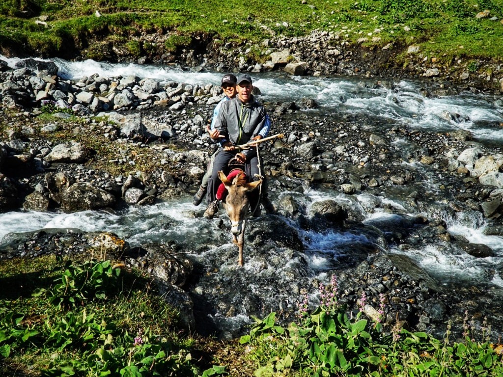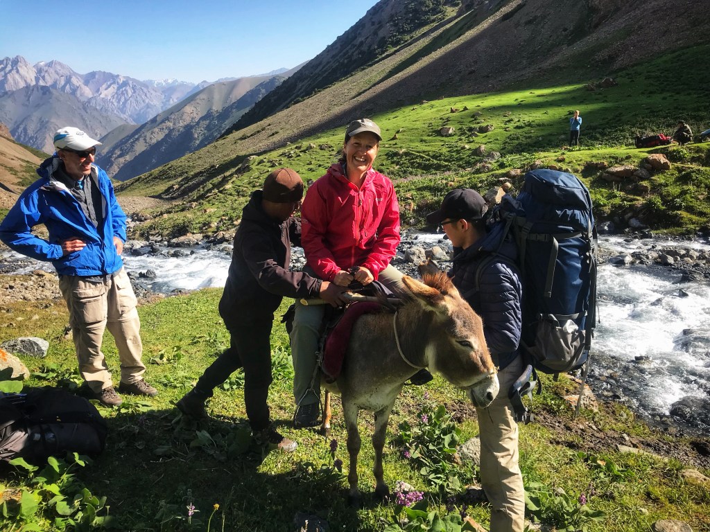 Each of us takes turn riding the donkey with one of of our porters as our bags are ferried across by Maksat, who seems to relish leaping across the river from boulder to boulder. We each arrive, one by one, on the other side with dry feet. For my part, I discover that, for shallower crossings, I prefer the donkey bridge to the horse bridge, if only because the potential fall would be less severe.