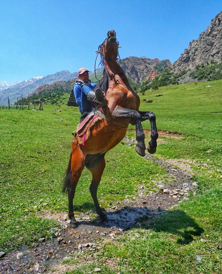 Just as we are putting our bags down, a man comes galloping up on a horse, stopping just in front of us. Timu tells us that he is very happy today because he has just learned that his wife has just given birth to his third child back in Osh. He reigns his horse up for us to show his excitement.