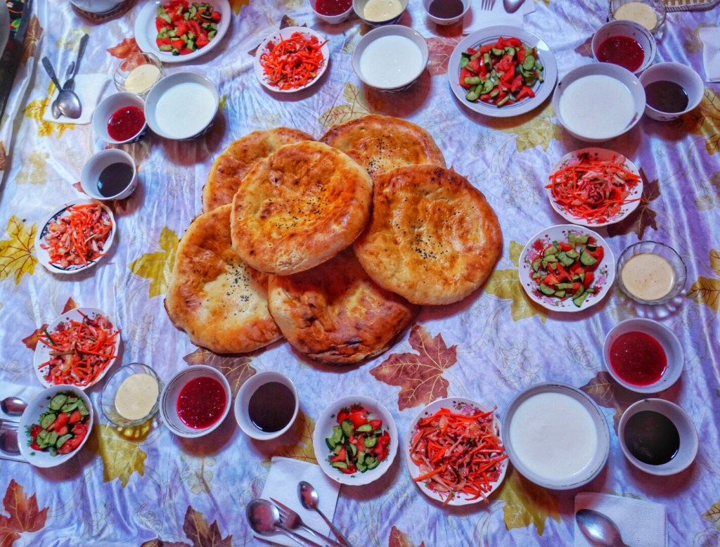 We are invited into the yurt for lunch, and right away we can tell that this is going to be a special meal. The dastarkon or dining cloth is arrranged beautifully with piles of fresh bread in the middle, small plates of scrumptious salads and little bowls of jams and fresh cream scattered all about.
