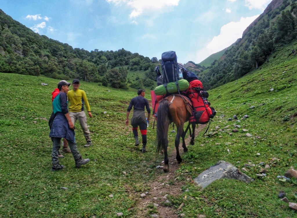 We make our way up the valley and cross the river on a footbridge, which is a big thrill. We are always happy to avoid a ford where we can! The horseman catches up to us here and offers to carry the porters’ bags up to his camp on his horse. The boys are thrilled and tie two of the bags together to drape over the horse’s back. They hand him a third, which he wears on his back and then takes Timu’s bag and carries it on his lap. It’s a wonder the horse can even move with all that weight, but off they go. With nothing to carry, the porters practically skip their way up the trail.