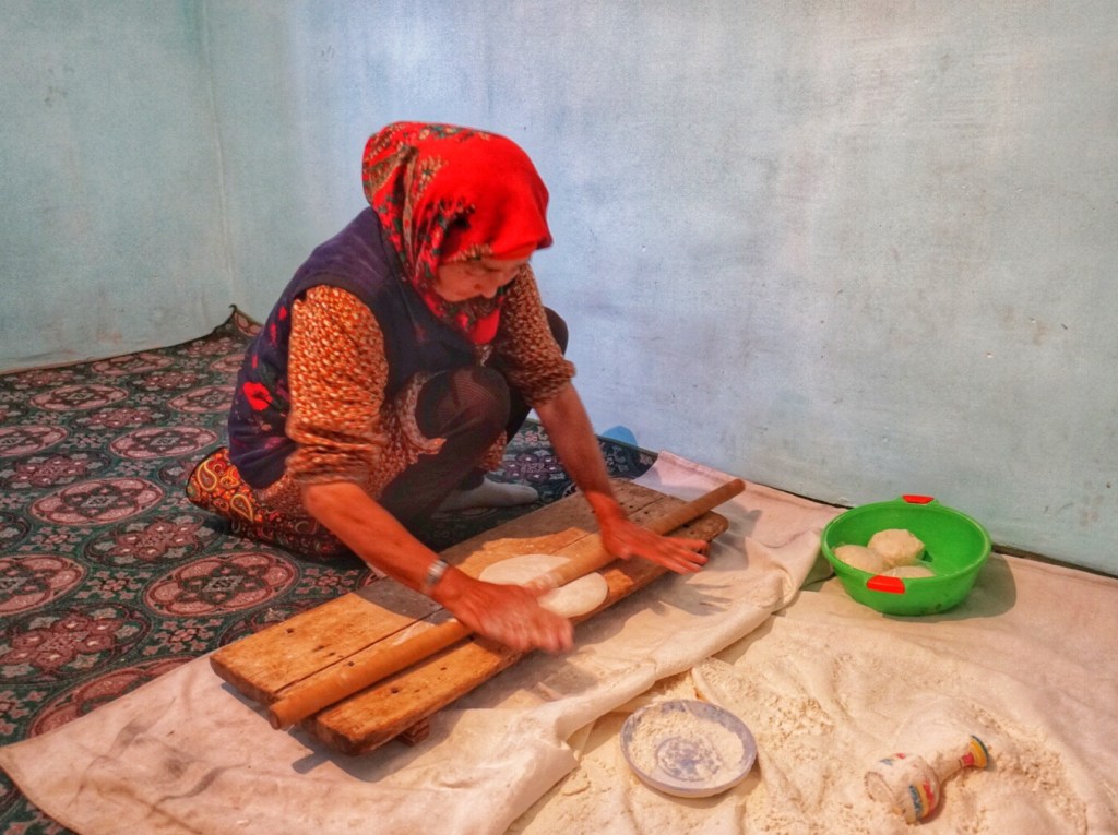 After our bread, jam and tea, we are invited back into the room where one of the women starts to roll out the dough using a long wooden stick on a 3-foot wide wooden plank. She rolls it out, adding flour and making it thinner and thinner with each pass. By the time she’s done, the large dough circle that she has created has a diameter of nearly three feet.