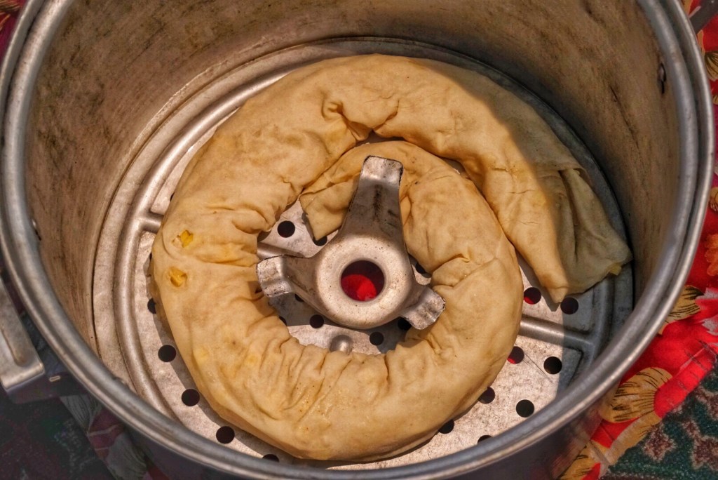She passes the dough over to another woman who coats every inch of it with a thin layer of oil. She then takes the filling of diced potato, onion and garlic and sprinkles it out evenly across the dough. Once it is covered, she takes one edge of the sheet that the dough is on and lifts it, causing it to roll up on itself. We all spontaneously cheer in amazement. The dough then gets rolled into a spiral and placed on a steam plate and placed in a big pot. The whole process gets repeated again another three times.