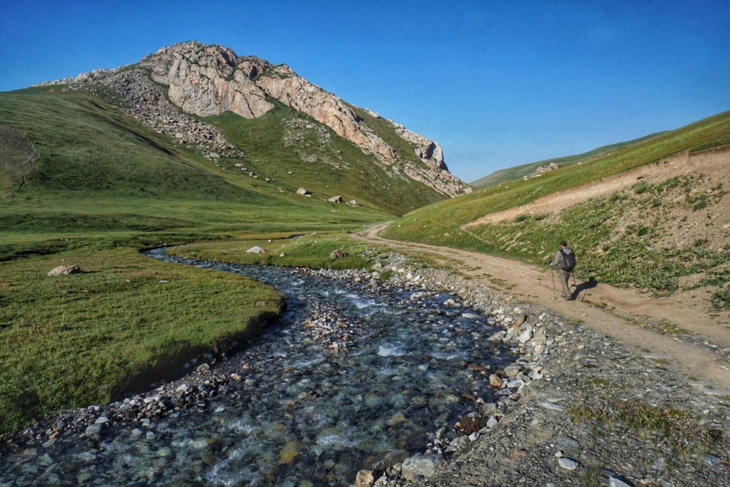 Despite a little rain and wind overnight, it’s bright and sunny, and even a little on the cool side until the sun crests the ridge and basks the valley in sunlight. We wave goodbye to our hosts as we cross the stream that runs alongside this yurt camp and begin to head down the valley with the sun at our backs.