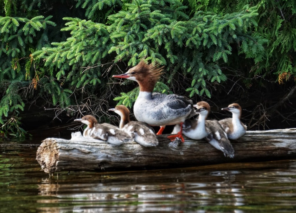 We discovered that the Merganser chicks are growing, but, sadly, those huge broods we saw earlier in late June seem to be much smaller at this point in the season. It was still impressive to see the hardy survivors.